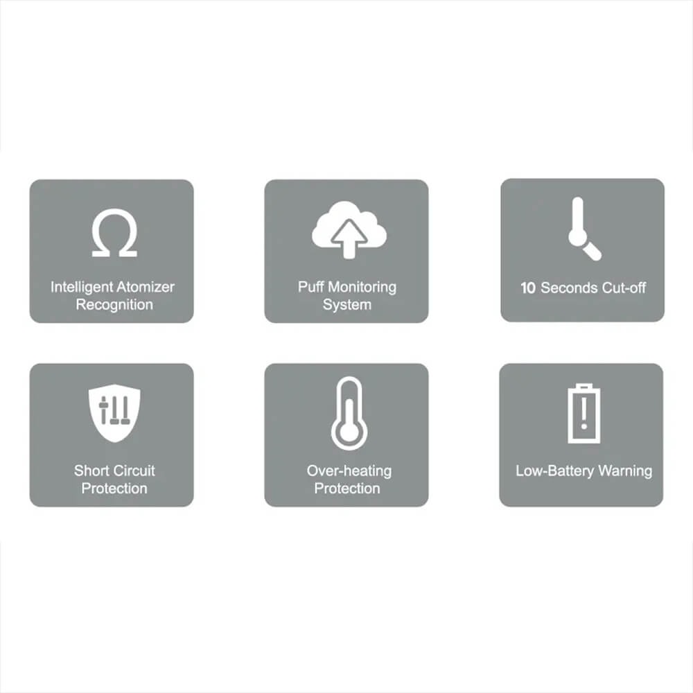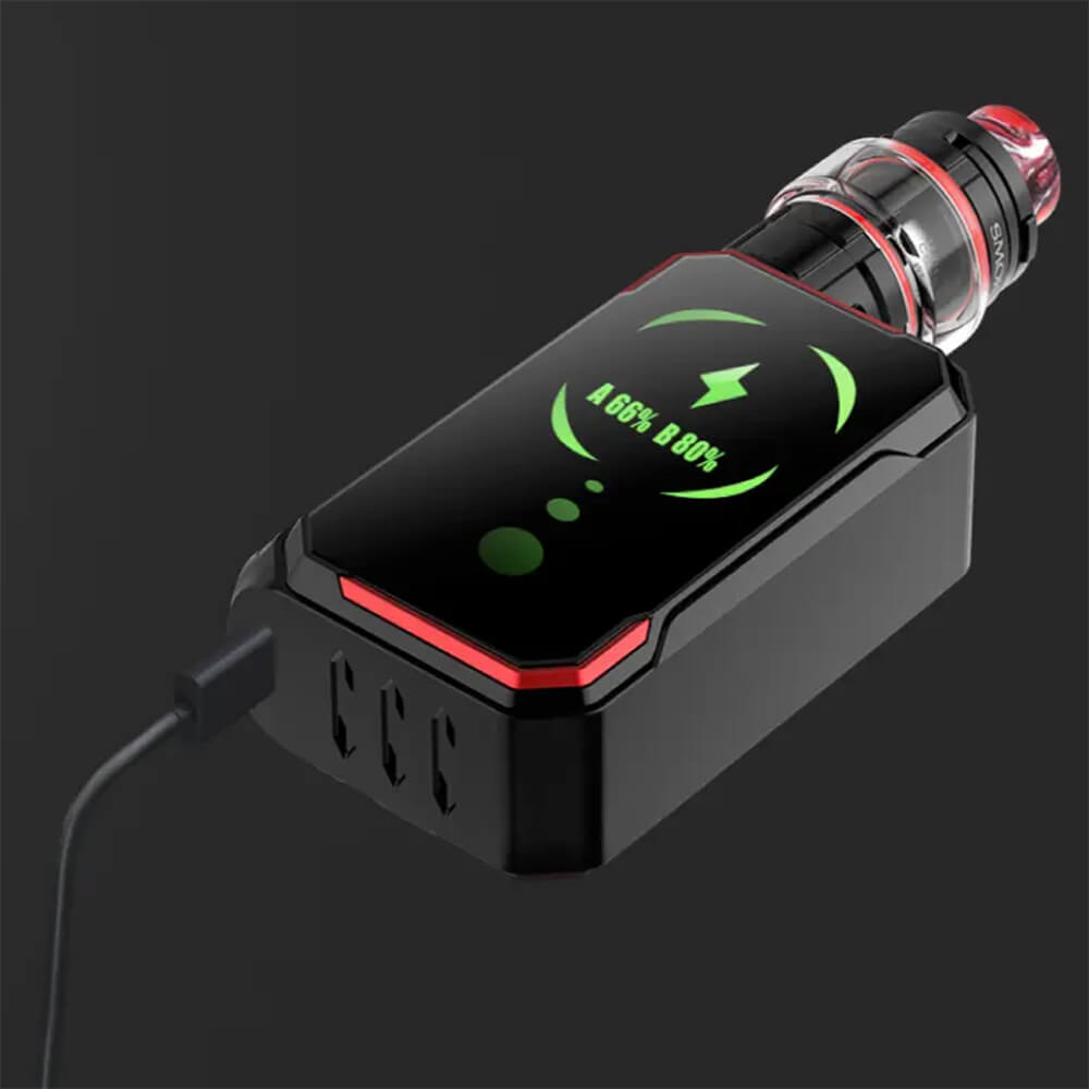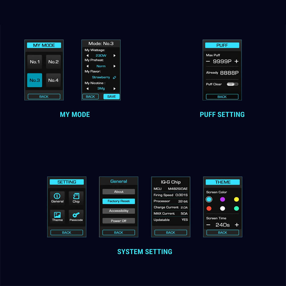 Der Mod beinhaltet den neuen innovativen IQ-G-Chipsatz und benötig zwei separat erhältliche 18650er Akku-Zellen, um den Betrieb aufnehmen zu können. Geladen wird wie gewohnt mit dem beigefügtem USB-Kabel vom Typ-C. Die maximale Ausgangsleistung beträgt 230W / 0.5V-8.2V (100°C-300°C), dabei erstreckt sich der Widerstandsbereich von 0.05 Ohm bis 2.5 Ohm. Im VW / TC-Mode wird gearbeitet und alle Vape-Infos sind auf dem 2.4 Zoll Touch-Display mühelos ablesbar. Für eine sorgenfreie Nutzung wurden unterschiedliche Schutzschaltungen installiert.