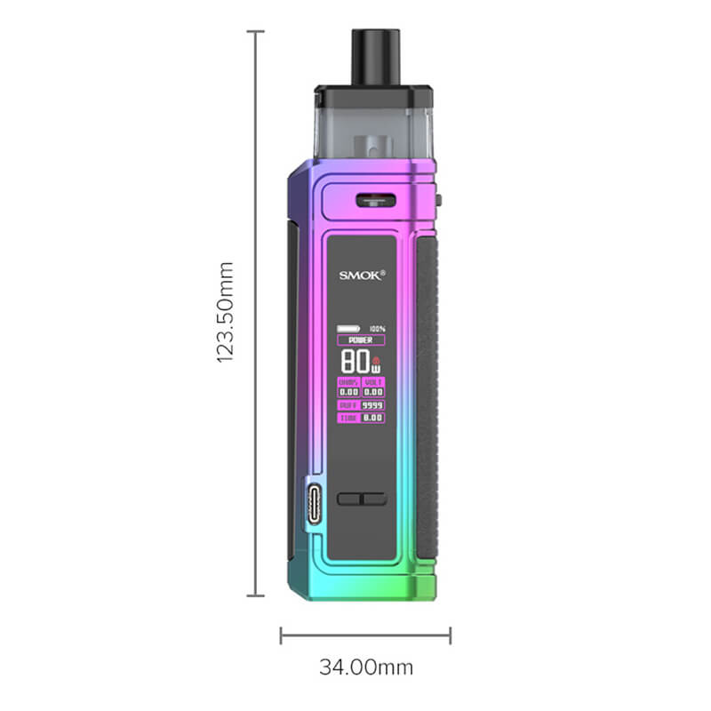 SMOKs G-Priv Pro Pod Kit beisitzt die handlichen Maße von 123.5mm x 34mm x 27mm (115g) und ist in den Farben Matt-Schwarz, Gunmetal und Chrome verfügbar.