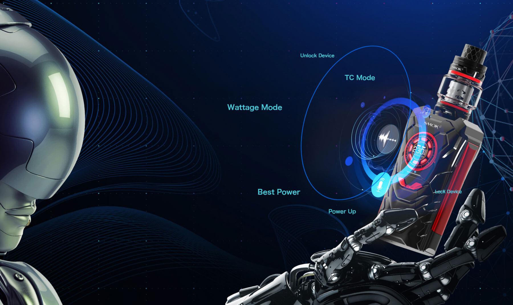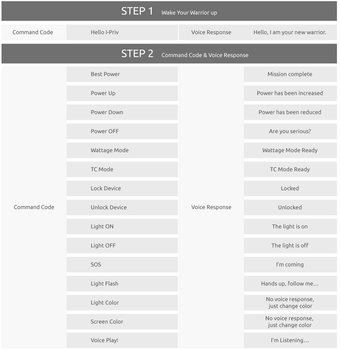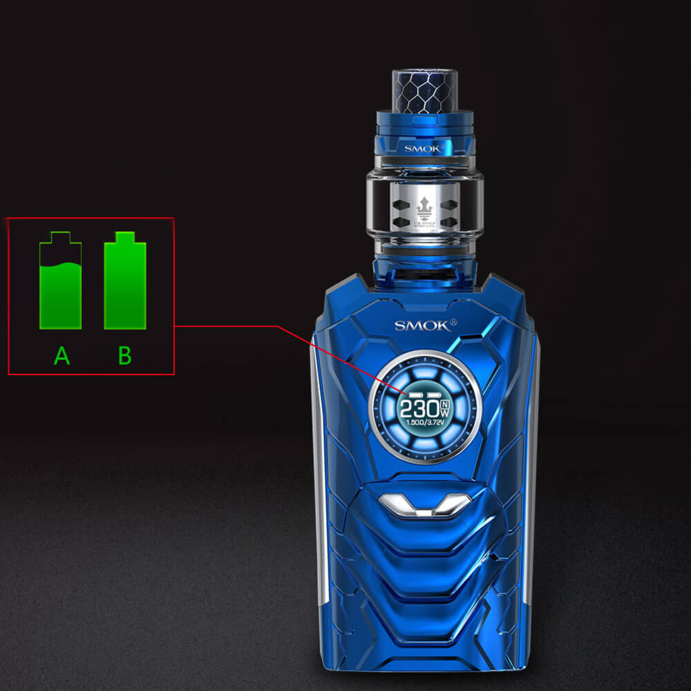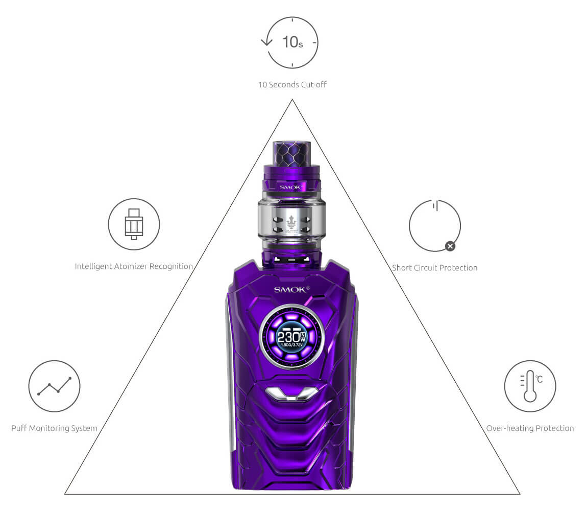 Gestaltet, geformt und getrimmt wie ein kleiner Worrior nimmt das Kraftpakt Befehle auf, antwortet und befolgt sie. Dabei erreicht er Ausgangsleistungen von bis zu 230W bei max. 8.2V. Die sprachliche Steuerung wird über 16 Kommandos geregelt. Der runde Bildschirm veranschaulicht klar und verständlich die verwendeten Werte und kann auch manuell gesteuert werden. VW / TC, Speichermodus, Vaping-Effekt, Spannung, Batterielebensdauer, Widerstandswert sind nur einige ablesbare Parameter. Eine umfangreiche Auswahl an verwendbaren Akkus, die zusätzlich gekauft werden müssen, steht zur Verfügung (je 2x 18650 / 20700 / 21700). Durch die Schnellladefunktion mit dem USB Kabel sind die Zellen zügig wieder einsatzbereit. Der I-Priv bietet mehrere Arten von Schutzmaßnahmen, um potenzielle Risiken zu vermeiden.