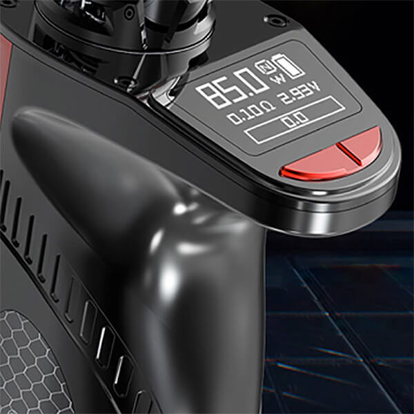 Der visuell auffällige Akkuträger mit Pistolengriffoptik hat viele verspielte Details. Die geschwungene, ergonomische Form sorgt dafür, dass der Mod ideal in der Hand liegt. Alle Bedienelemente wurde so positioniert, dass sie stets bequem erreichbar sind. Sogar der 0.66 Zoll Bildschirm befindet sich oberhalb des Mods, um auch während des Dampfens einen uneingeschränkten Einblick über alle Daten zu erhalten. Eine besondere Spielerei besteht beim Einsetzen des Akkus. Mit einem Klick wird das Batteriefach entriegelt und fällt herraus, ähnlich wie bei einem Magazin einer Waffe. Für die Inbetriebnahme können dreierlei verschiedene Akku-Zellen verwendet werden, wodurch sich die maximale Ausgangsleistung verändert (1x 18650 Akku = 85W / 1x 20700 oder 21700 Akku = 100W). Die verbrauchte Kapazität wird über das mitgelieferte USB-Kabel zügig geladen. Über selbigen Anschluss können jederzeit neueste Updates aufgespielt werden. Gearbeitet wir im VW (0.1Ohm-2.5Ohm) und im TC (0.05Ohm – 2.0Ohm) Bereich bei einer Ausgangsspannung von 0.5V-9V. Natürlich wurde die Sicherheit nicht außer Acht gelassen und ein Multischutz installiert.