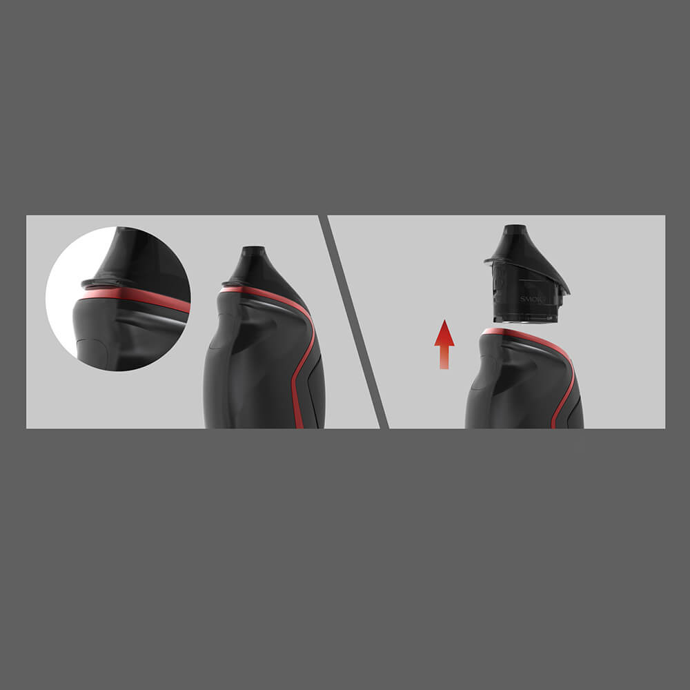 Die Cartridge lässt sich spielend einfach dem Mod entnehmen, um entweder das Liquid nachzufüllen oder den Verdampferkopf zu wechseln. Unterhalb des Mundstücks wird der Pod nach oben gedrückt, um ihn zu entfernen. Ein kleiner Silikonstöpsel muss geöffnet werden, damit das Einfüllloch zum Auffüllen freiliegt. Die Nord Coils (0.6 Ohm, 25W / 0.8 Ohm, 16W / 1.4 Ohm, 12W) werden auf ähnliche Weise ausgetauscht. Diese Coils bedienen sowohl die Vorlieben der DL- als auch die der MTL- Dampfer.