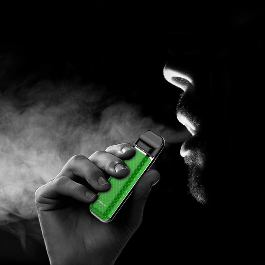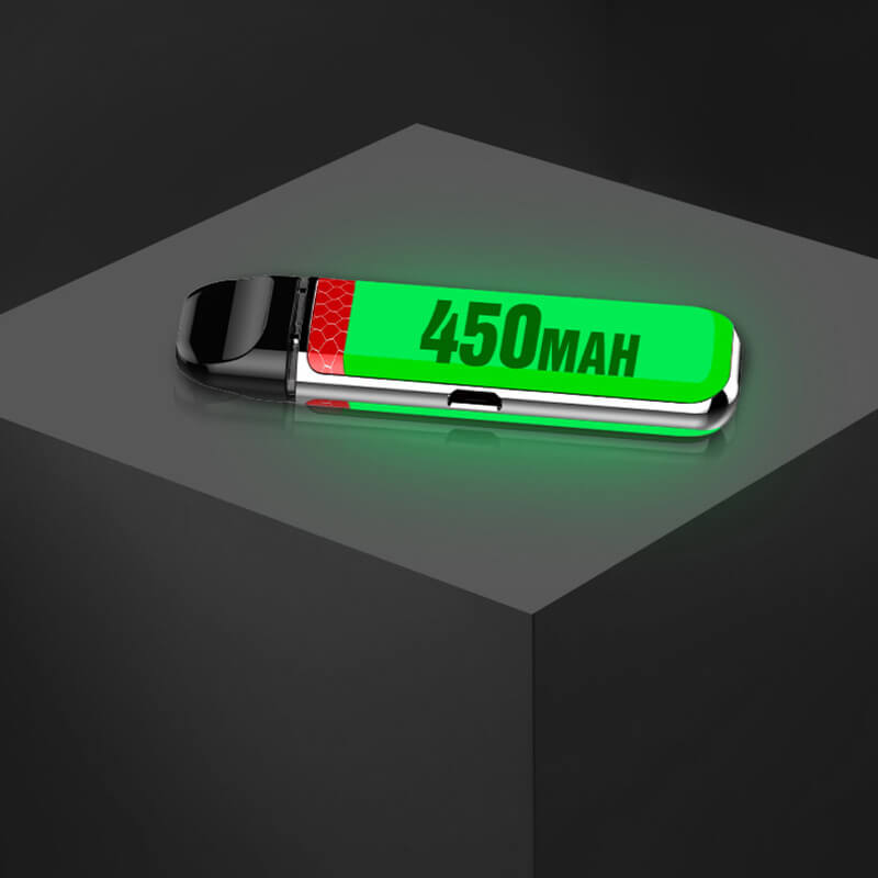 Das AIO – System ist sehr gradlinig mit abgerundeten Ecken, zudem kompakt und besonders handlich. Visuell betrachtet ähnelt das Kit einer kleinen Pfeife. Auch das Mundstück ist dem einer Pfeife nachempfunden, was den Vorteil hat, dass es sich optimal der Formgebung der Lippen anschmiegt, was für ein angenehmes Gefühl während der Nutzung sorgt. Beidseitig ist das All – in One – Gerät mit einem plattiertem Kobramuster verziert und aufgrund der zaghaften Maße von 88.3mm x 24.3mm x 14.3mm hat es eine perfekte Pocketgröße und kann stets überall mitgenommen werden.