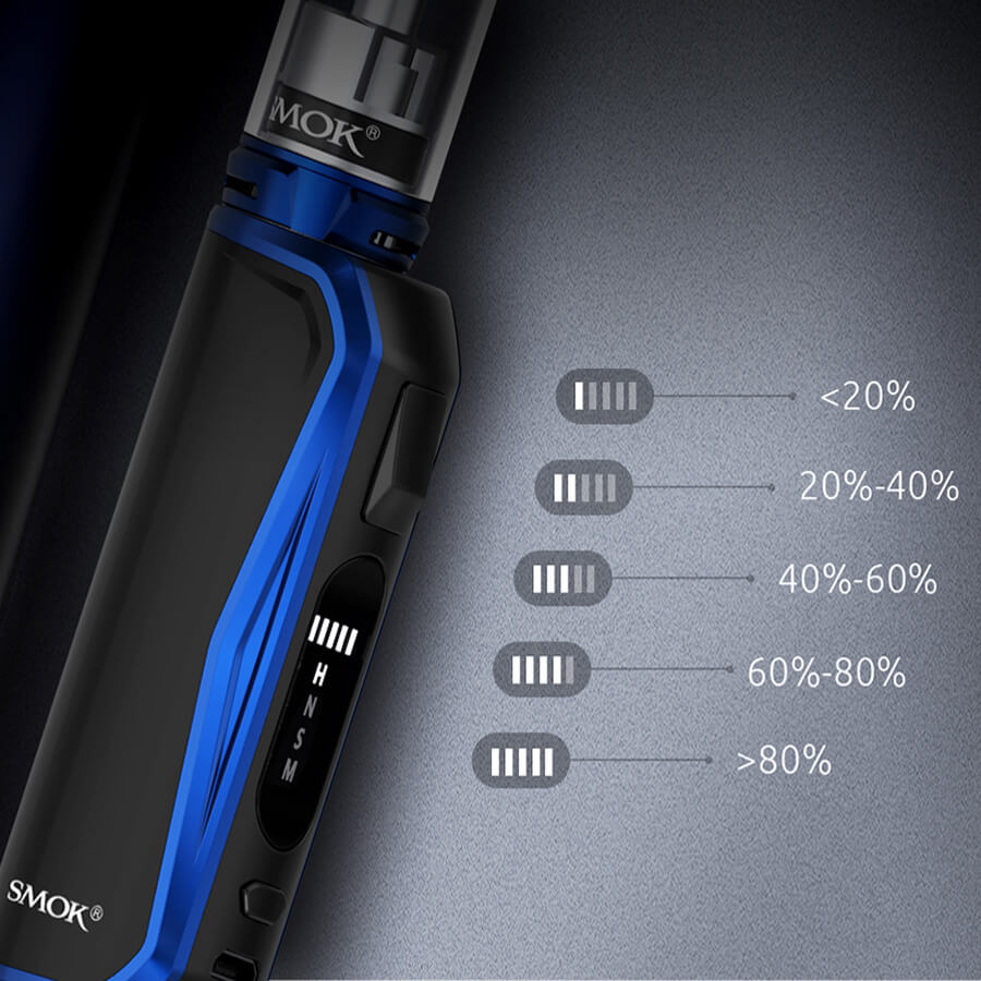 Für ein langanhaltendes Dampferlebnis bekam das Gerät eine integrierte 1200mAh Batterie verpasst, die nach dem Gebrauch effizient und schnell per USB mit 1A geladen werden kann. In vier verschiedenen Watteinsellungen kann gedampft werden (M / S / N / H). Durch Drücken der Einstelltasten reichen die Steuerungsoptionen von 5W bis 30W / 2.4V-6.0V. Über das kleine OLED-Display können alle Parameter schnell und klar abgelesen werden. Über die Up- / Downschalter wird durch das Menü gesteuert.