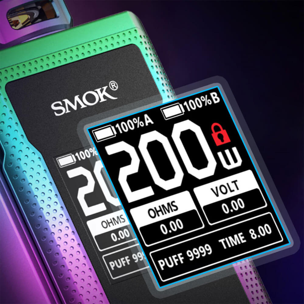Im Inneren des Akkuträgers verbirgt sich der IQ-S Chipsatz der neusten Generation, mit dem im VW und Bypass-Mode eine Leistungsabgabe bis zu 200 Watt möglich ist, bei Widerständen zwischen 0.1 Ohm-2.5Ohm. Mit zwei separat erhältlichen 18650er Akkuzellen wird der Betrieb aufgenommen und für eine lange Laufzeit gesorgt. Wenn nötigt kann der Akku über den USB-C Anschluss wieder geladen werden. Überhalb des Ports befinden sich die +/- Tasten, mit denen bequem durch das Menü gesteuert werden kann. Alle Einstellungen sind klar auf dem 1.3 Zoll TFT-Farbdisplay ersichtlich.