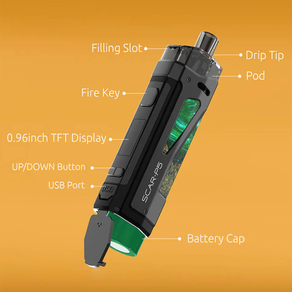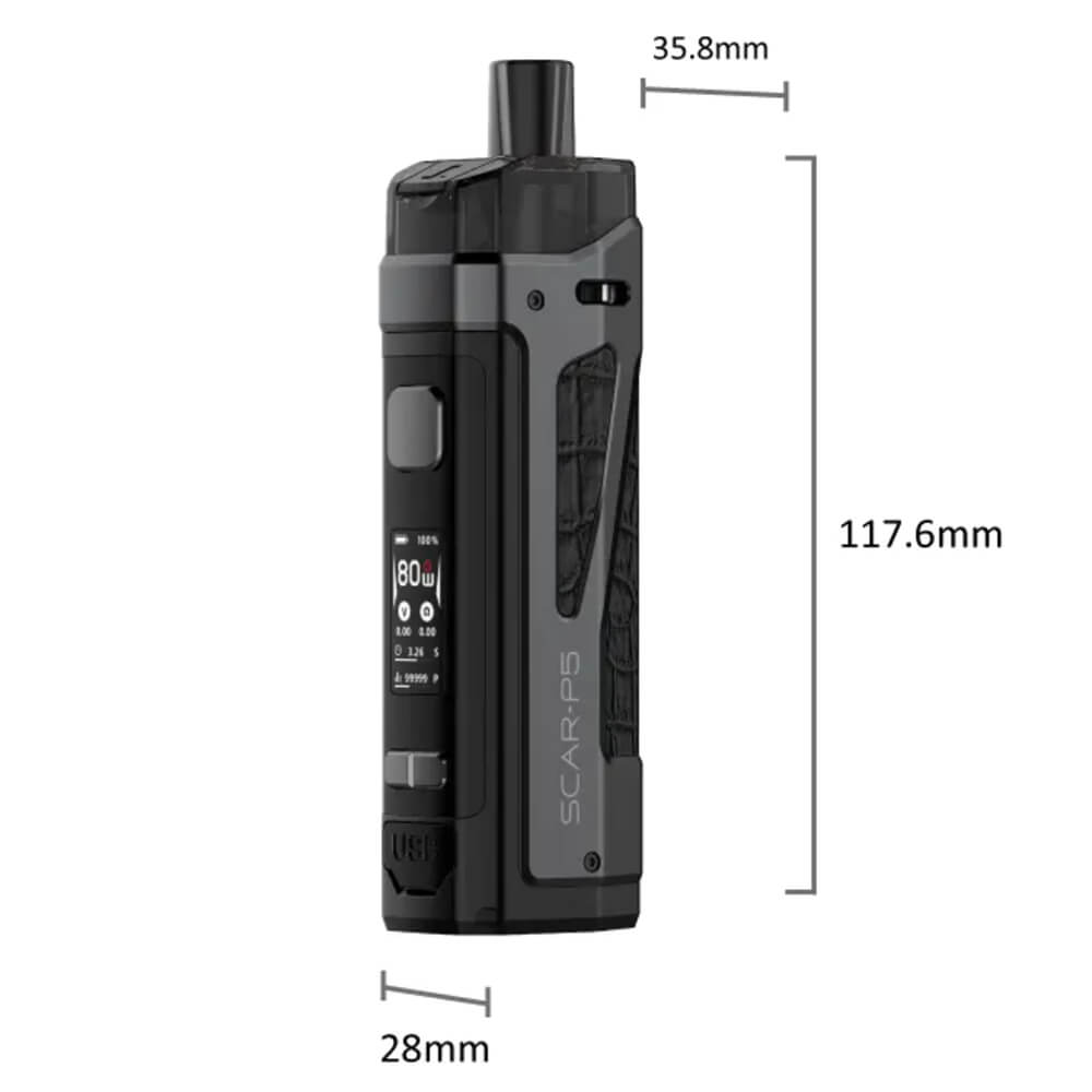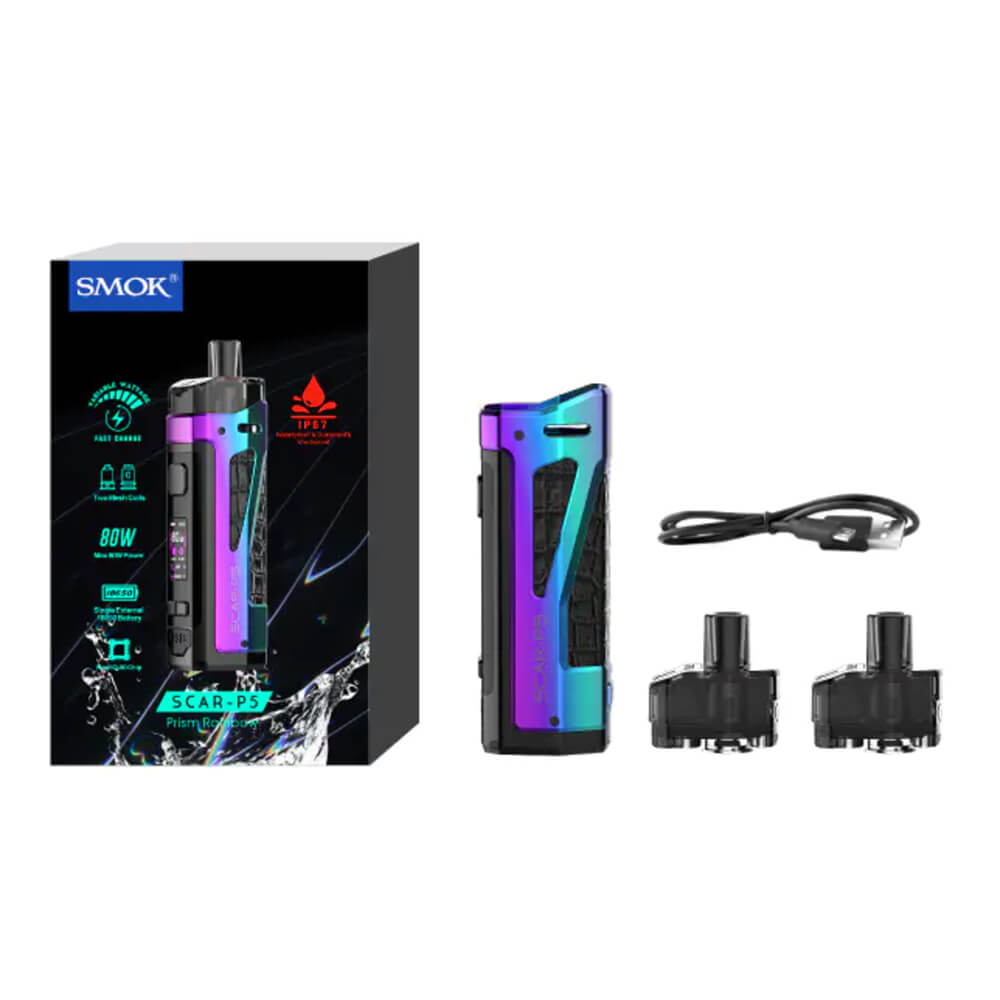 Das Scar P5 Kit ist das neueste Pod-System aus dem Hause SMOK. Es ist eine abgewandelte Version des Scar P3, aber ebenfalls nach IP67 resistent gegen Wasser, Staub und Stöße. Zudem ist der Akku nicht bereits verbaut und die Verdampferköpfe (RPM / RPM2 Coil) austauschbar.