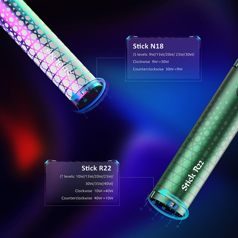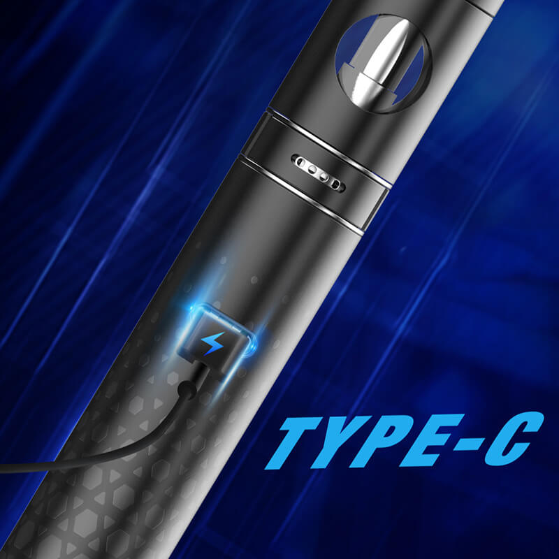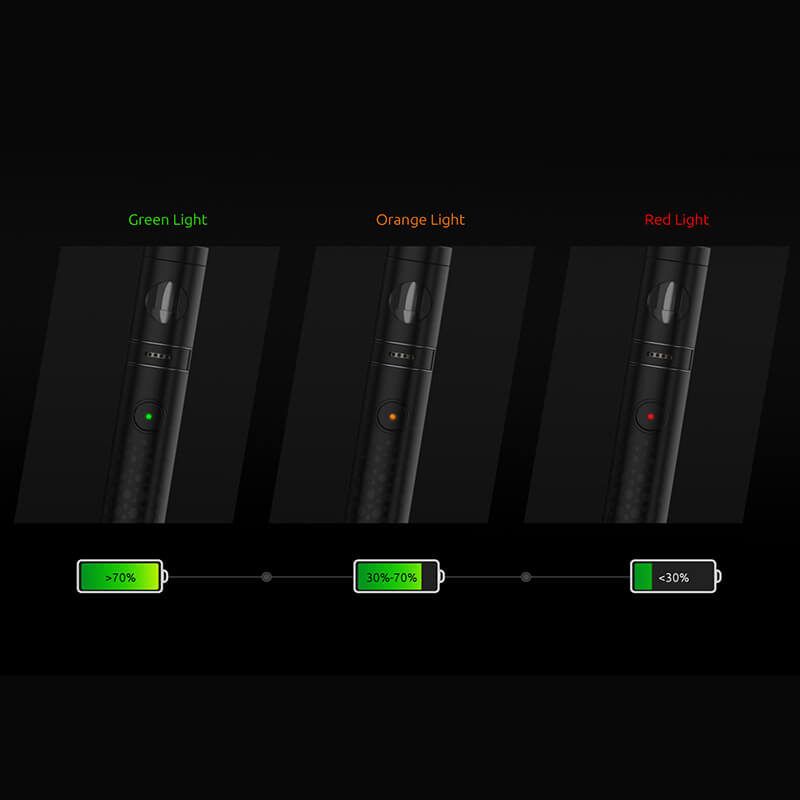 Durch den integrierten 1300mAh Akku wird das Kit angetrieben, welcher über das mitgelieferte USB-C Ladekabel mit 0.75A zügig wieder geladen werden kann. Die Aktivierung geht über den Firebottom vonstatten. Eine LED im Feuerknopf übermittelt zuverlässig der Ladestand der Batterie (Grün:70%-100% / Orange:70%-30% / Rot: 30%-0%). Im VW / Powermode beträgt die Ausgangsleistung 9W-30W / 2.0V-4.0V bei einem Widerstand zwischen 0.5 Ohm bis 3.0 Ohm. Am Ende des Pens befindet sich ein Drehring, mit dem die Wattleistung in 5 Stufen (9W / 15W / 20W / 25W / 30W) frei einstellbar ist.