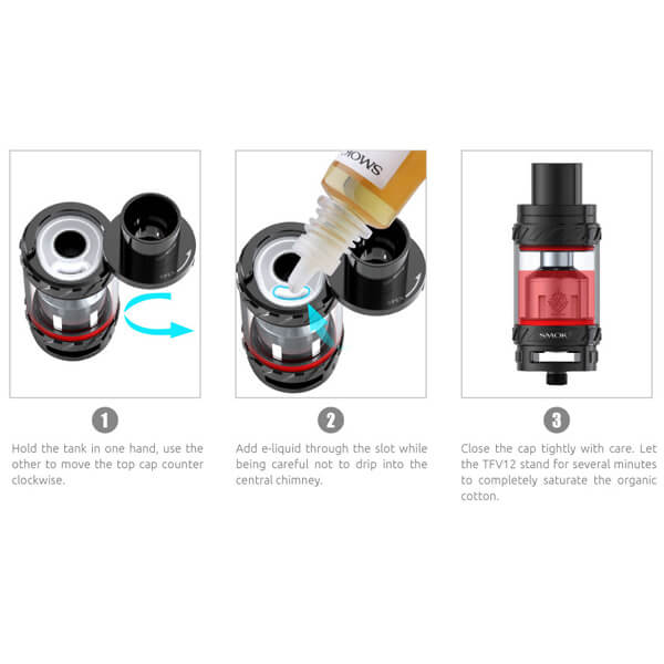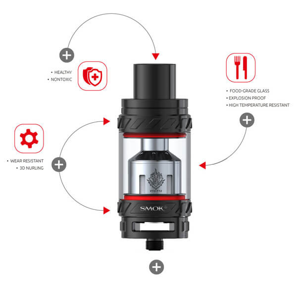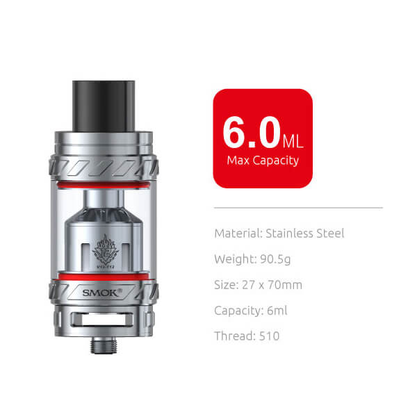 SMOK legt mit dem TFV12 noch einen oben drauf! Wem der TFV8 von SMOK bereits gefallen hat, der wird den TFV12 lieben. Bis zu 350 Watt, ein Tankvolumen von 6ml und ein Durchmesser von 27.0mm - der King hat sich seinen Namen auf jeden Fall verdient. Die Base des TFV12 hat sinnvoller Weise nur einen Durchmesser von 25.0mm erhalten, so dass auf den meisten Akkuträgern kein unansehnlicher Überstand entsteht. Durch die schwenkbare Topcap, wie auch schon vom TFV8 bekannt, wird der Cloud Beast King von oben befüllt (Topfill).