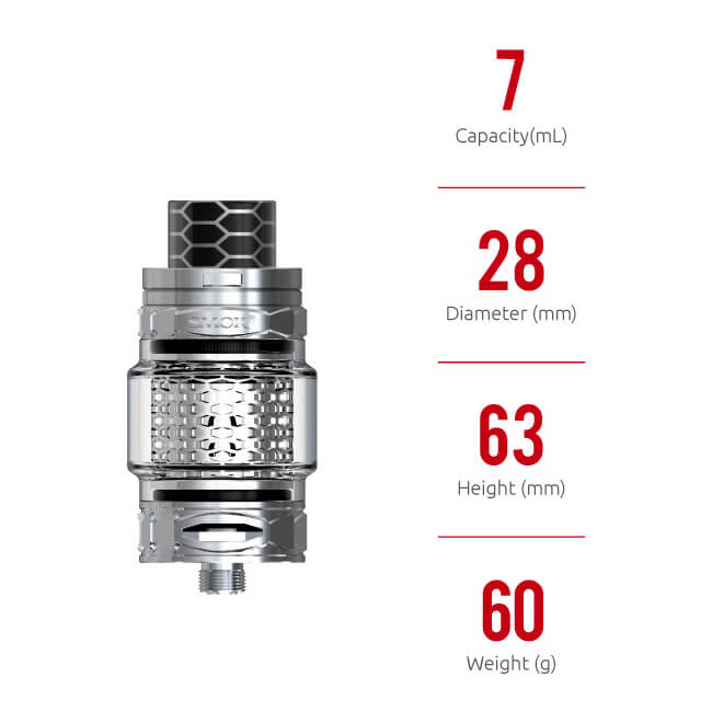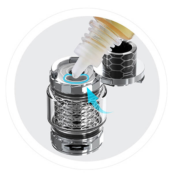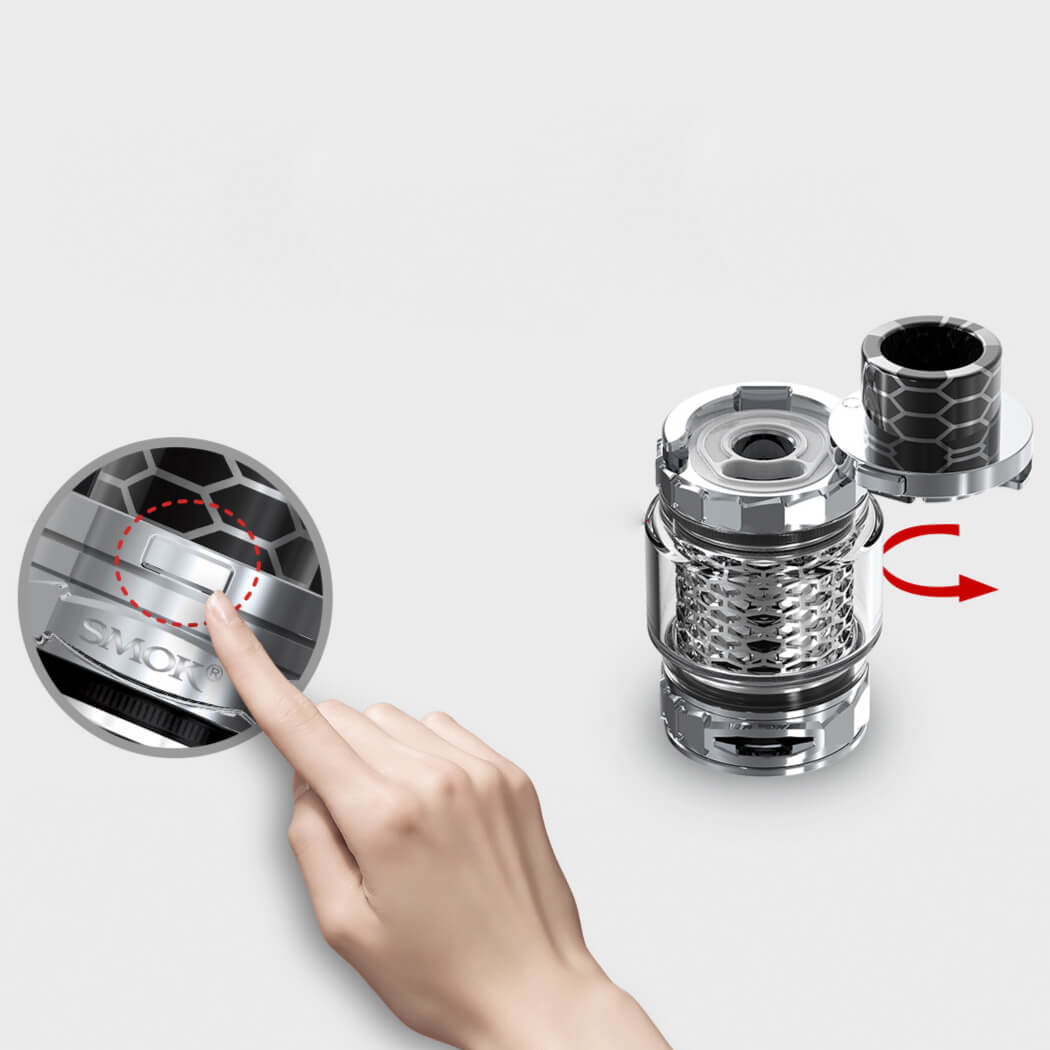 Die Höhe des Verdampfers beträgt 63mm und der Durchmesser 28mm. Er hat ein Fassungsvermögen von 7ml. Auch hier kann personalisiert werden, denn bei Bedarf ist ein Global Glass zusätzlich erwerbbar, mit dem man auch auf ein 8ml Tankvolumen aufstocken kann. Die Push – to – Open - Mechanik entriegelt den Verschluss und macht anschließend ein einfaches Auffüllen des Tanks von oben möglich.