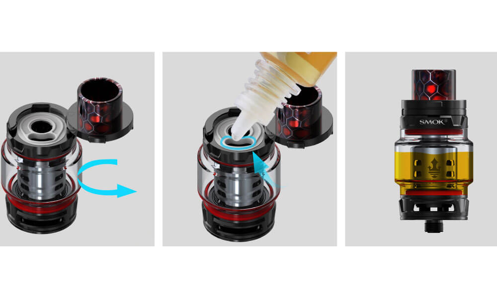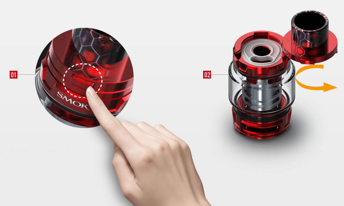 Der Prince hat ein gewaltiges Tankvolumen von satten 8ml. Der brandneue Verschlussmechanismus erleichtert das Filling von oben maßgebend. Durch Betätigen des Verriegelungsknopfes schwenkt die Cap auf und schon kann sauber und schnell das Liquid in die Liquidschlitze gegeben werden. Das große Mundstück lässt die Luftzirkulation noch besser vonstatten gehen und die Bottom AFC regelt die Luftstromstärke. Zum Prince Verdampfer bringt SMOK auch frische Coils an den Start. Die V12 Prince Verdampferköpfe. 0.12 Ohm bis 0.4 Ohm stehen zur Auswahl und werden besonders Fans des direkten Lungenzuges erfreuen.