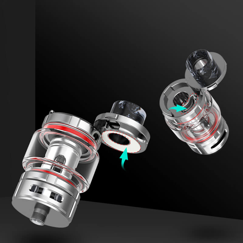 Der Verdampfer bringt ein unglaubliches Füllvolumen von satten 9ml im bauchigen Glass-Tube mit, so dass nicht mehr ständig nachgefüllt werden muss. Die Befüllung verläuft wie gehabt von oben via Topfilling. Nach einem simplen Knopfdruck, kann die Cap zur Seite geschoben werden und das Liquidloch erscheint. Dieser Verschlussmechanismus macht das Nachfüllen sehr komfortabel. Zusätzlich wurde der Tank ordentlich abgedichtet, um ein Auslaufen fast unmöglich zu machen.