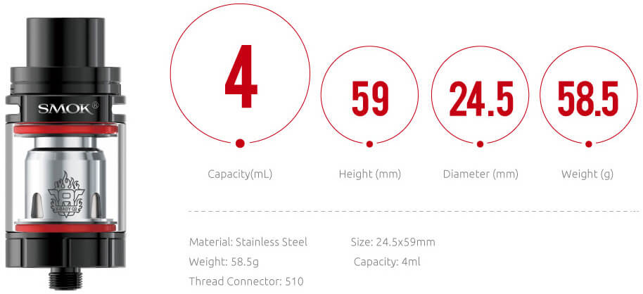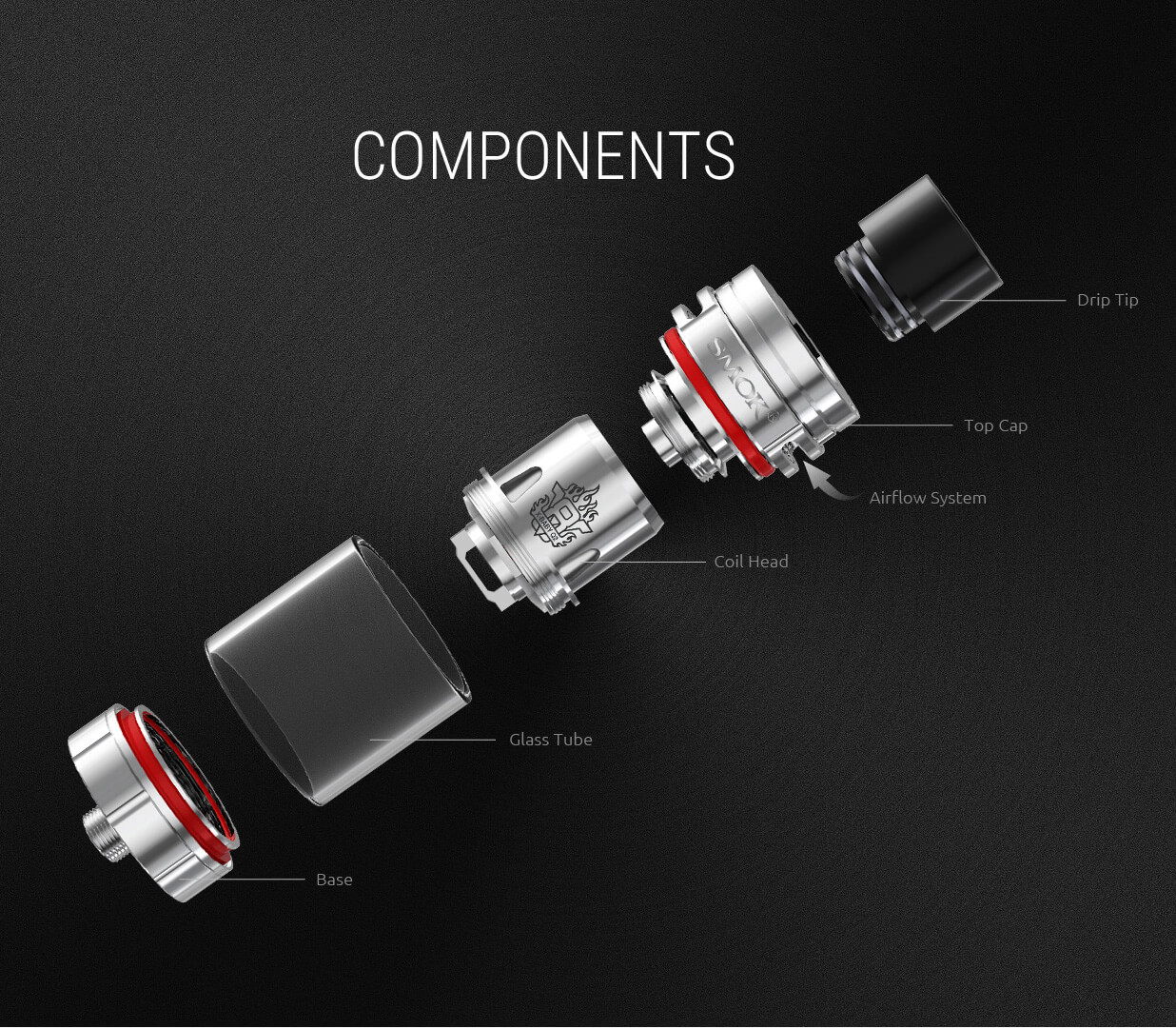 Der X-Baby kommt mit einem stattlichen Füllvolumen von 4 ml und einem Durchmesser von 24.5 mm daher. Der Tank besitzt eine hochwertige Glasverstärkung. Für den Atomizer wurde eine verbesserte TFV8 X-Baby Turbo Engines Coil Struktur entwickelt. Der Q2 Dual Coil mit 0.4 Ohm ist bereits vorinstalliert und der M2 mit 0.25 Ohm wird mitgeliefert.