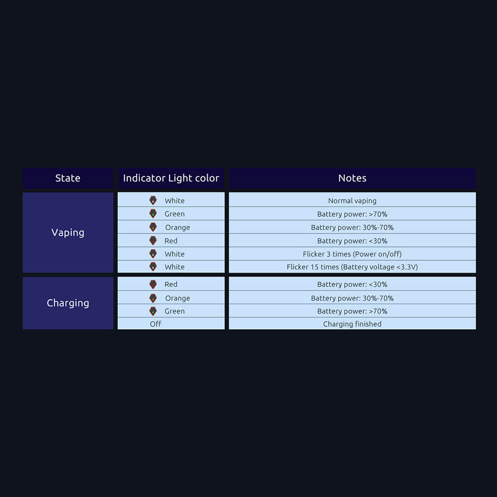 Mit nur einem Feuerknopf, der gut erreichbar positioniert wurde, wird dieser Pen bedient. Um das Gerät Ein-oder Auszuschalten muss man diesen Bottom einfach nur gedrückt halten. Das kleine LED-Licht im Knopf gibt in verschiedenen Farben Informationen zum Dampfstatus und dem Akkustand.