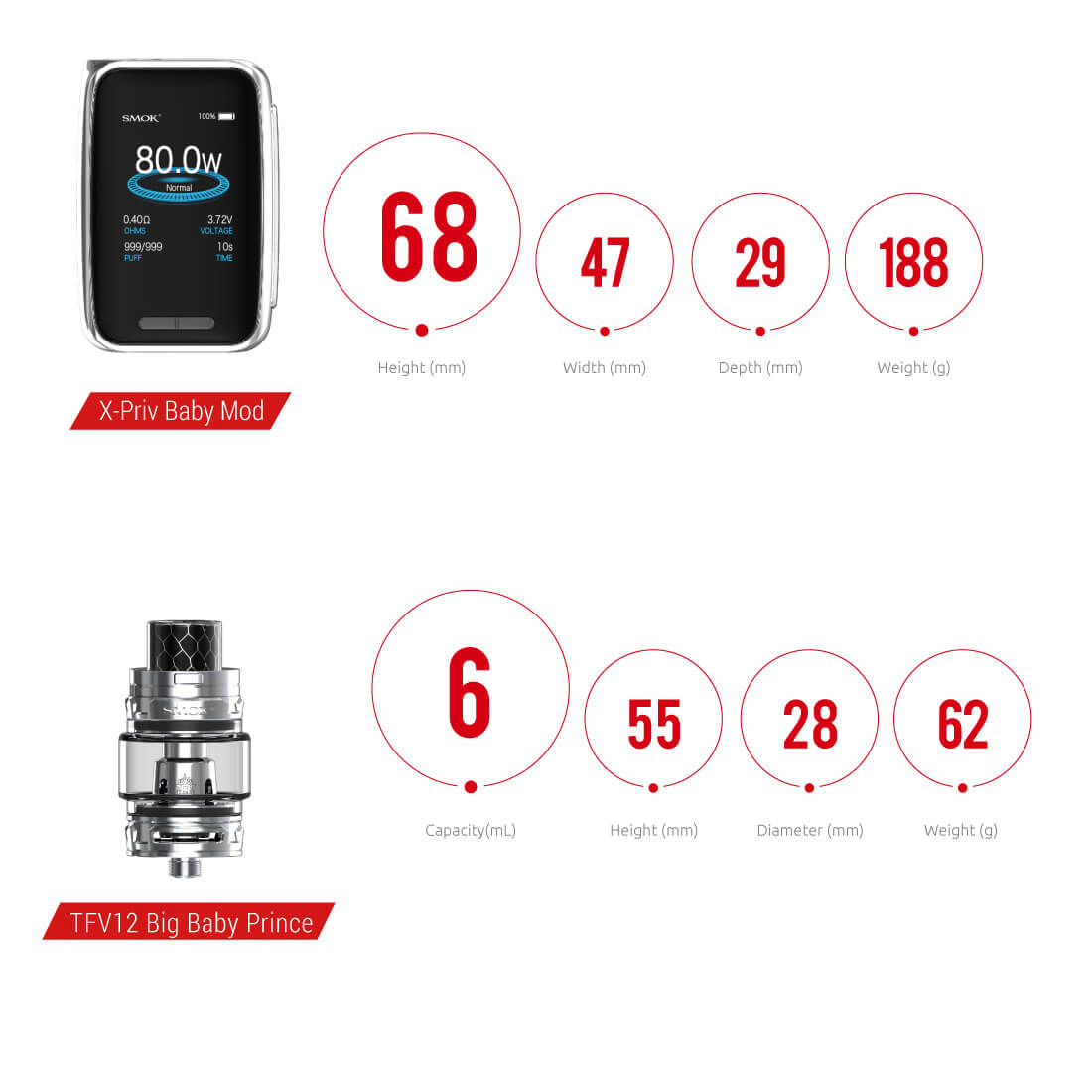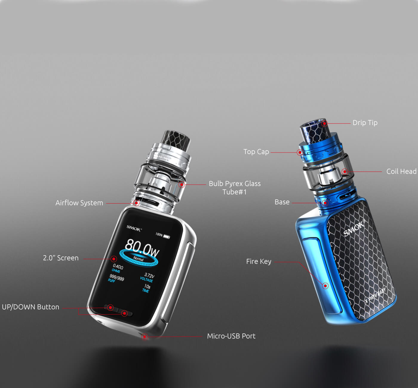 Vom Äußerlichen unterscheiden sich beide Mods kaum. Natürlich ist der X - Priv Baby Mod kleiner und kompakter, was ihn besonders handlich und zum idealen Begleiter macht. Auf das ansprechende Design des Vorgängers wurde nicht verzichtet und selbstverständlich ist auch hier das große 2 Zoll – Display überragend. Anschmiegsam fügt es sich dem Gesamtbild an und bringt alle zu entnehmenden Information klar zum Vorschein. Das Menü ist benutzerfreundlich gestaltet und lässt sich spielend leicht manövrieren. Eine verbaute Akkukapazität von 2300mAh hält eine Weile an und kann den Mod mit bis zu 80W betrieben. Gearbeitet wird wie gehabt in den gängigen Modis.