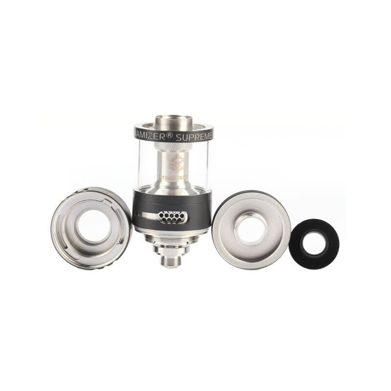 Das All-in-one-Gerät kann als Tankverdampfer, mit 5ml oder 8ml Volumen oder auch als Tröpfler (RDA) verwendet werden. Geliefert wird der Aromamizer Supreme mit einem Postless Deck. Er ist besonders für die Direct Lung- Dampfer ausgelegt. Materialien aus Edelstahl und Pyrex (Borosilikatglas) wurden hochwertig verarbeitet und verleihen dem Selbstwickler Tank ein schlichtes aber solides Äußeres. Nach dem Abschrauben der Top Cap kann durch ein Top Fill-System eine einfache Befüllung des Tanks von oben erfolgen, was Dank der angenehm großen Öffnungen sauber und schnell vonstatten geht. Nebst einer am Boden positionierten Airflow, die für einen kühlenden Luftstrom sorgt, verfügt der Supreme RDTA V2 auch über eine Liquidkontrolle. Der Lieferumfang ist recht umfangreich und verspricht vielfältige Einsatzmöglichkeiten.