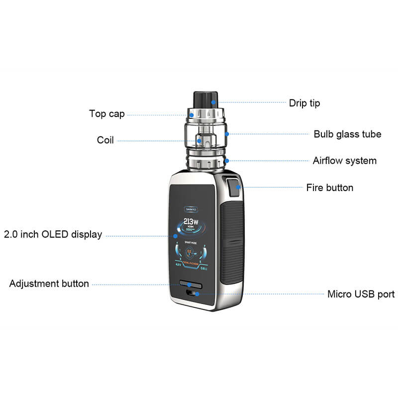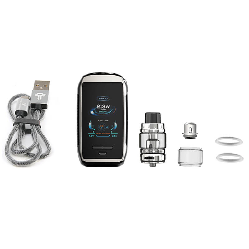 Der Akkuträger wird von zwei separat erhältlichen 18650er Batterien betrieben, welche nach Verbrauch über das 1.5A USB-Kabel wieder zügig geladen werden können. Die Ausgangsleistung beträgt 213 Watt / 100°C - 315°C und der Spannungsbereich liegt zwischen 1.0V-7.5V. Die Modi Power, TC, TCR und der Geschmacksmodus stehen bereit (Widerstand: 0.05Ohm-3.0 Ohm). Der HD Bildschirm hat 2 Zoll und zeigt alles farblich an. Die Bedienung durch das Menü ist ein Kinderspiel und selbsterklärend.