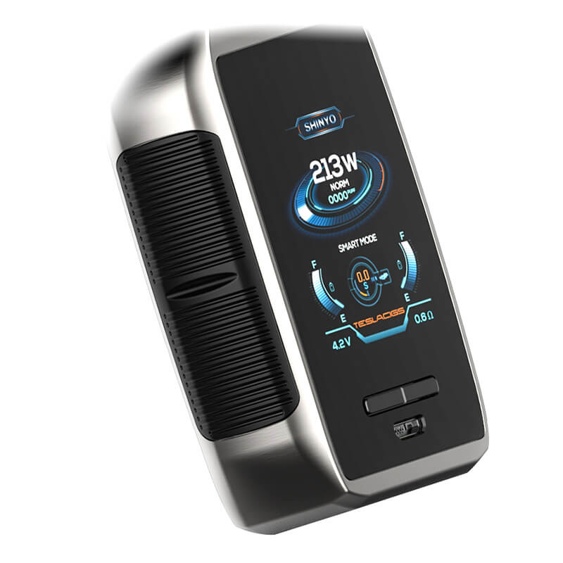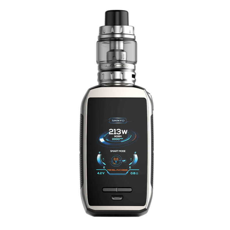 Teslas neues Komplettset ist das silberne Shinyo Kit, welches aus dem Shinyo Mod und dem Tind Tank besteht und zusammen die Maße von 141mm x 50mm x 29mm besitzt und aus einer Zinklegierung, Edelstahl und Kunststoff (PC) besteht.