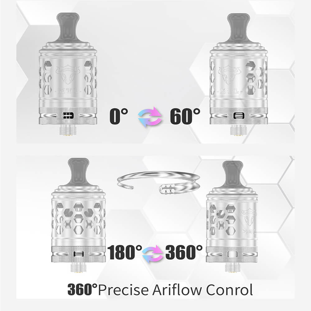 Eine ausgeklügelte 360 Grad Airflow Control sorgt für frische Luft und lässt sich stufenlos den eigenen Belangen nach einstellen, für seichte Backendampfgenüsse (MTL) oder einem restriktiven direkten Lungenzug (RDL).
