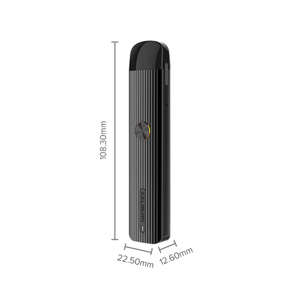 Uwell bringt das Caliburn G Kit in verschiedenen Farben (Schwarz / Grau / Blau / Rot) auf den Markt und legt auf ein schlichtes Design, mit kleinen Raffinessen (geriffelte Oberfläche für den optimalen Grip) besonderen Wert. Die kompakten Maße betragen nur 108.3mm x 22.5mm x 12.6mm, so dass das Kit mühelos verstaut werden kann.