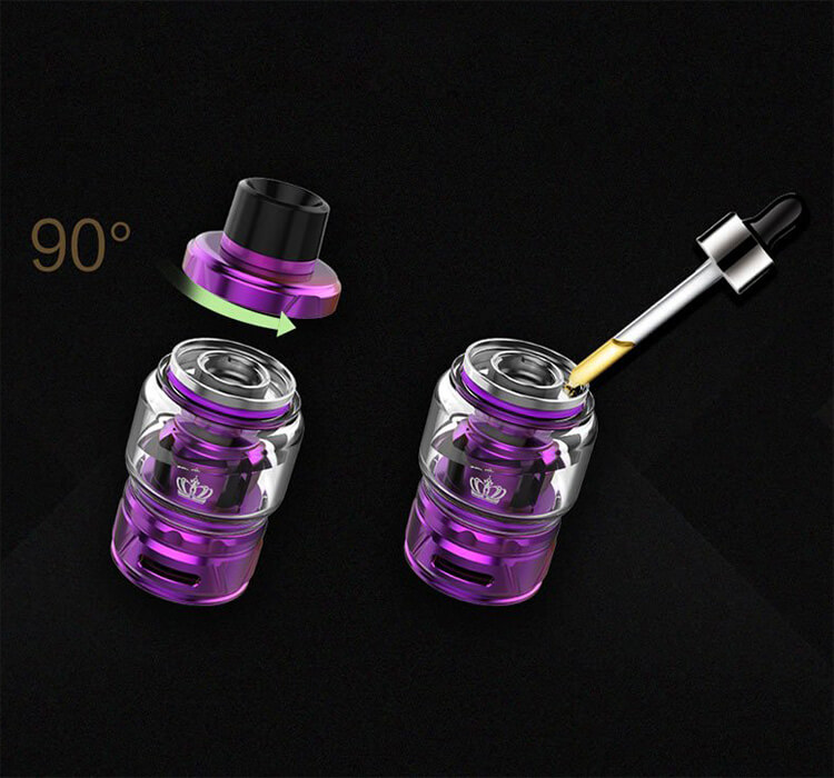 Mit dem Bubble-Glass bestückt, verfügt er über einen 6ml Tankvolumen. Dieses kann durch das beiliegende und gradlinige 5ml Tube ausgetauscht werden. Mit einer schnellen 90°C Schraubung kann die Top Cap abgenommen werden, so dass der Einfüllschlitz offen liegt und problemlos von oben nachgefüllt werden kann.