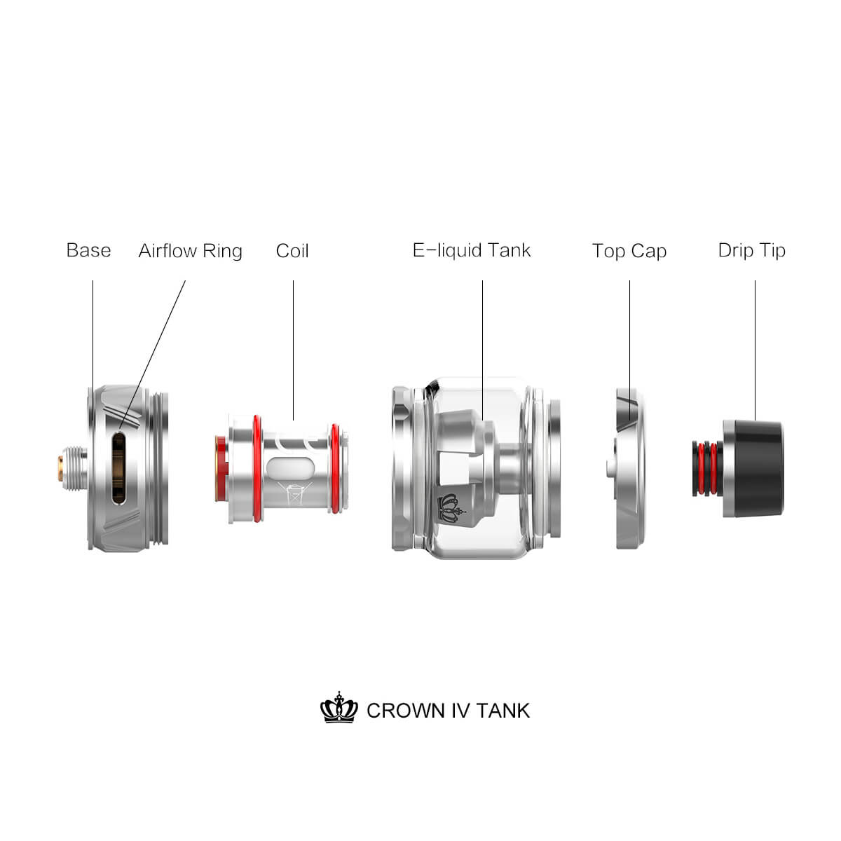 Der Crown 4 wird mit einem Dual SS904L Verdampferkopf mit 0.2Ohm (70W-80W) / 0.4Ohm (60W-70W) oder einem UN1 0.25Ohm (55W-65W) / Un2 0.23Ohm (60W-70W) Doppel-Helix-Mesh Coil verwendet. Diese sorgen für eine gleichmäßige Erwärmung und liefern hervorragenden Geschmack.