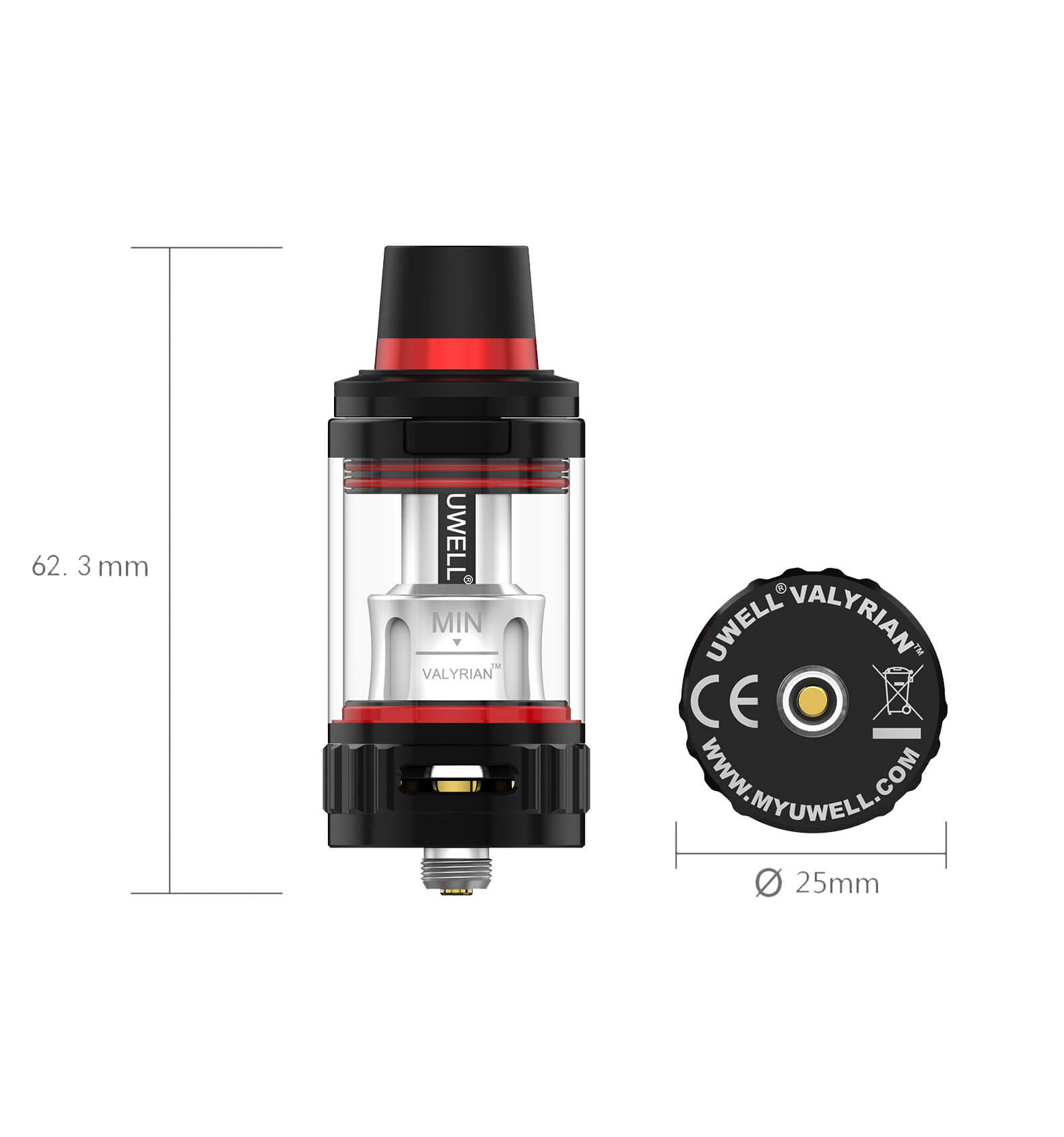 Für eine hohe Langlebigkeit verwendet Uwell bei der Herstellung des Valyrians eine neuartige und hochwertige Edelstahllegierung, was den Verdampfer vor Kratzern und Schrammen schützt. Das innovative Pin-System macht es möglich, den Verdampfer nach seinen eigenen Vorlieben einzustellen. Dabei geht es um Leistung, Geschmack und Dampfentwicklung. Ein kindersicheres Top-Fillsystem wurde verbaut, über das der 5ml Tank befüllt werden kann. Wem das nicht ausreicht, der kann es gegen ein 8 ml Pyrexglas austauschen (Nicht im Lieferunfang enthalten). On Top bietet der Valyrian eine stufenlos regulierbare Bottom Airflow. Das auswechselbare Delrin Drip Tip und drei verschiedene Coil Pins sind im Lieferumfang enthalten und sorgen für noch mehr Geschmack.