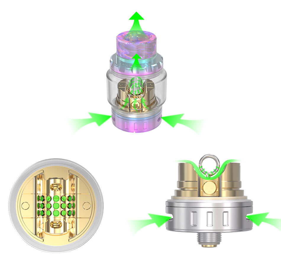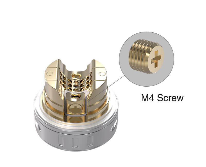 Das Hauptaugenmerkt liegt hier ganz klar in der Honey Comb Airflow. Wie eine Bienenwabe aufgebaut, verfügt sie über etliche Luftlöcher, die auf dem gesamten Postless Deck zu finden sind und so die Wicklungen mit ordentlich Luft in 180 Grad versorgen. Die Luftzufuhr wird an der Basis nach dem eigenen Belieben stufenlos eingestellt.