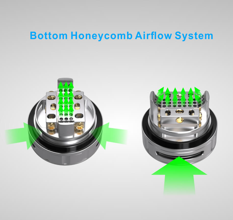 Auch die regulierbare Boden - Belüftung stellt beim Triple 2 RTA, eine Besonderheit dar. Die Honeycomb Airflow besitzt eine Vielzahl von Belüftungslöchern und wurde exakt unterhalb der Coils positioniert und liefert so einen gleichbleibenden Luftzug und eine konstante Wärmeverteilung. Daraus folgen beste Geschmacks - und Dampfergebnisse.