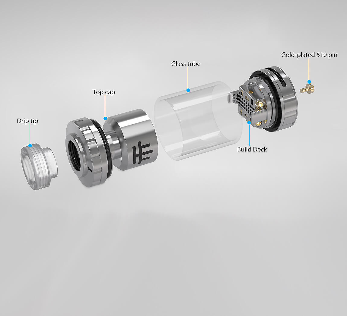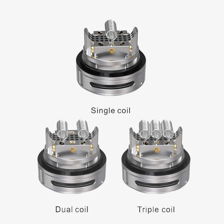 Zur Verfügung steht ein Postless Deck mit viel Platz, so dass ohne weiteres auch den fulminanteren Wicklungen genügend Raum geboten wird. Es bestehen gleich drei Möglichkeiten dieses Deck mit DIY - Coils zu bestücken. Es stehen Singlecoil, Dualcoil und Triplecoil- Varianten zur Auswahl, was diesen Atomizer sehr vielseitig einsetzbar macht. Schnell und kinderleicht sind die bevorzugten Versionen gebaut und befestigt.