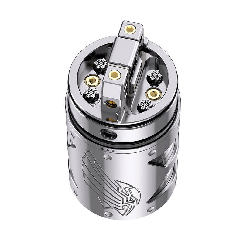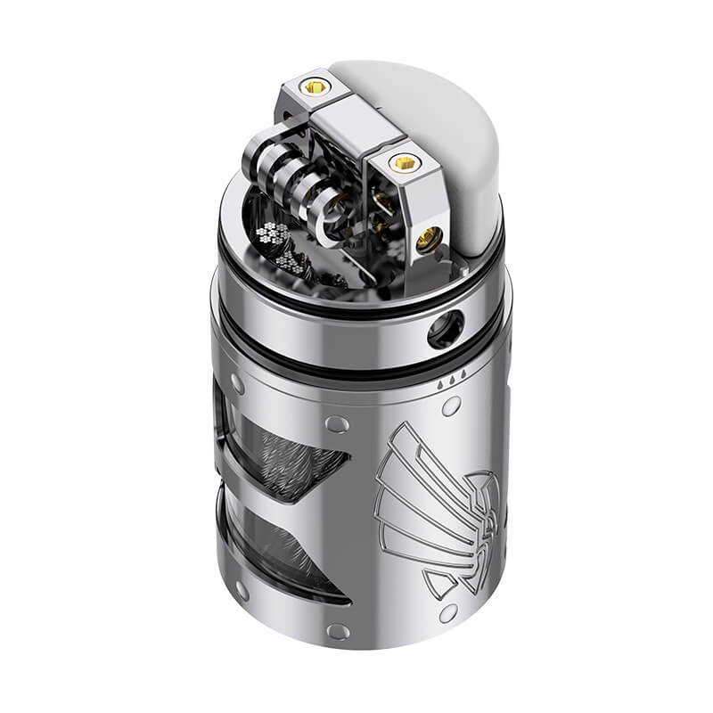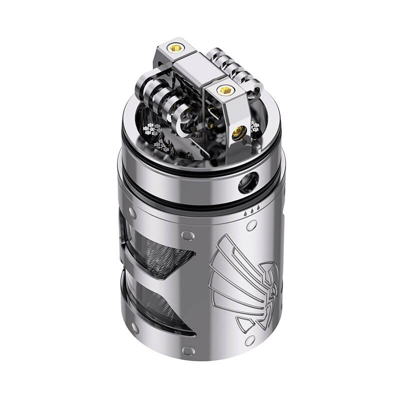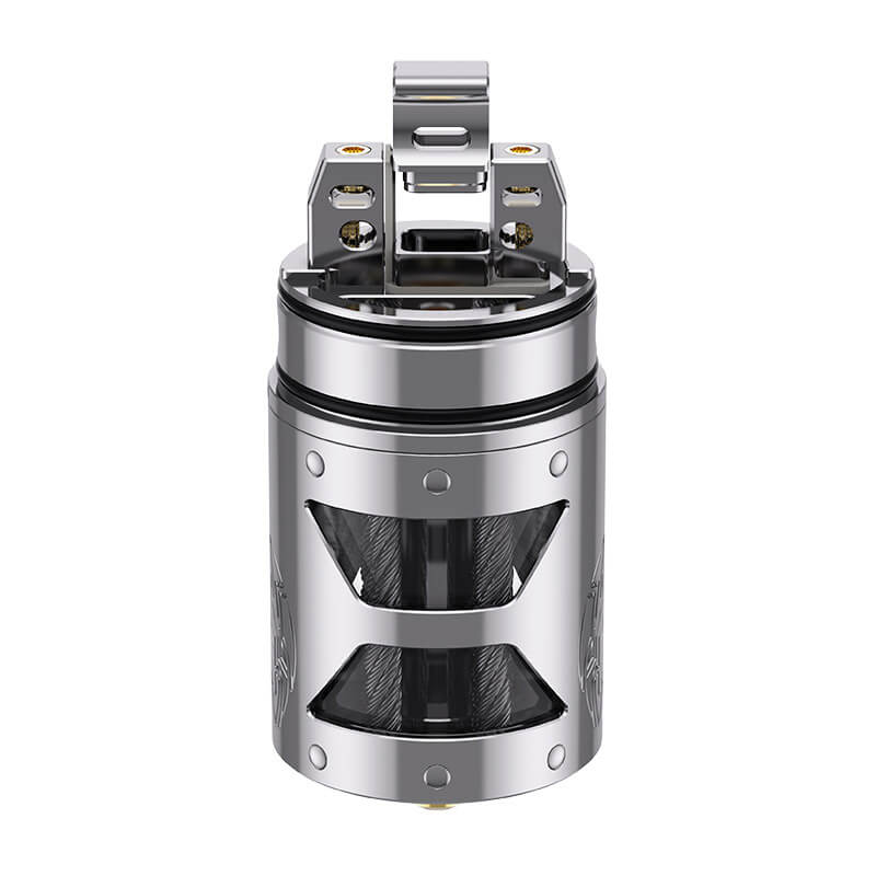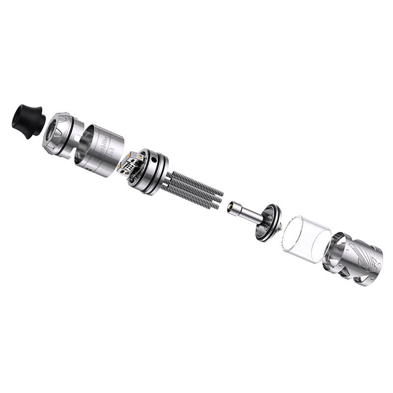 Schon rein optisch macht der Selbtswickler ordentlich was her. Das präzise hergestellte Tankcover aus Edelstahl erhielt formschöne Gravuren und dient zugleich als Schutz für das darunter befindliche Glas. In den drei zeitlosen Farben Schwarz, Gunmetal und Silber steht der RTA zur Verfügung. Mit den handlichen Maßen von 69.9mm in der Länge und 25.2mm im Durchmesser passt er auf alle geläufigen mechanischen und geregelten Akkuträger.
