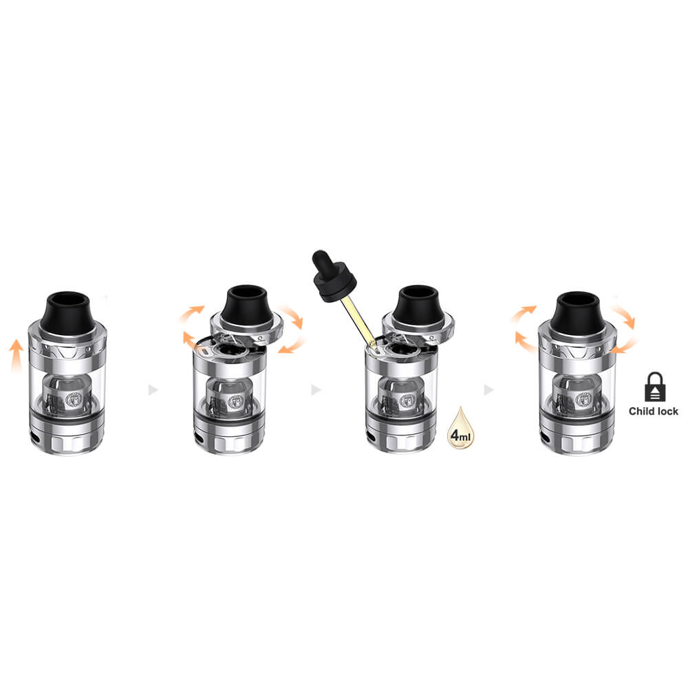 Vapeflys kindersichere Kriemhild 2 Tank verfügt über ein 4ml Tankvolumen, welches bequem von oben mit Liquid aufgefüllt wird. Dazu wird die Cap angehoben und um 360°C gedreht, wobei der Verschlussmechanismus reagiert. Im Lieferumfang befindet sich zusätzlich 5ml Bubbleglas, zur Aufstockung des Tankvolumens.