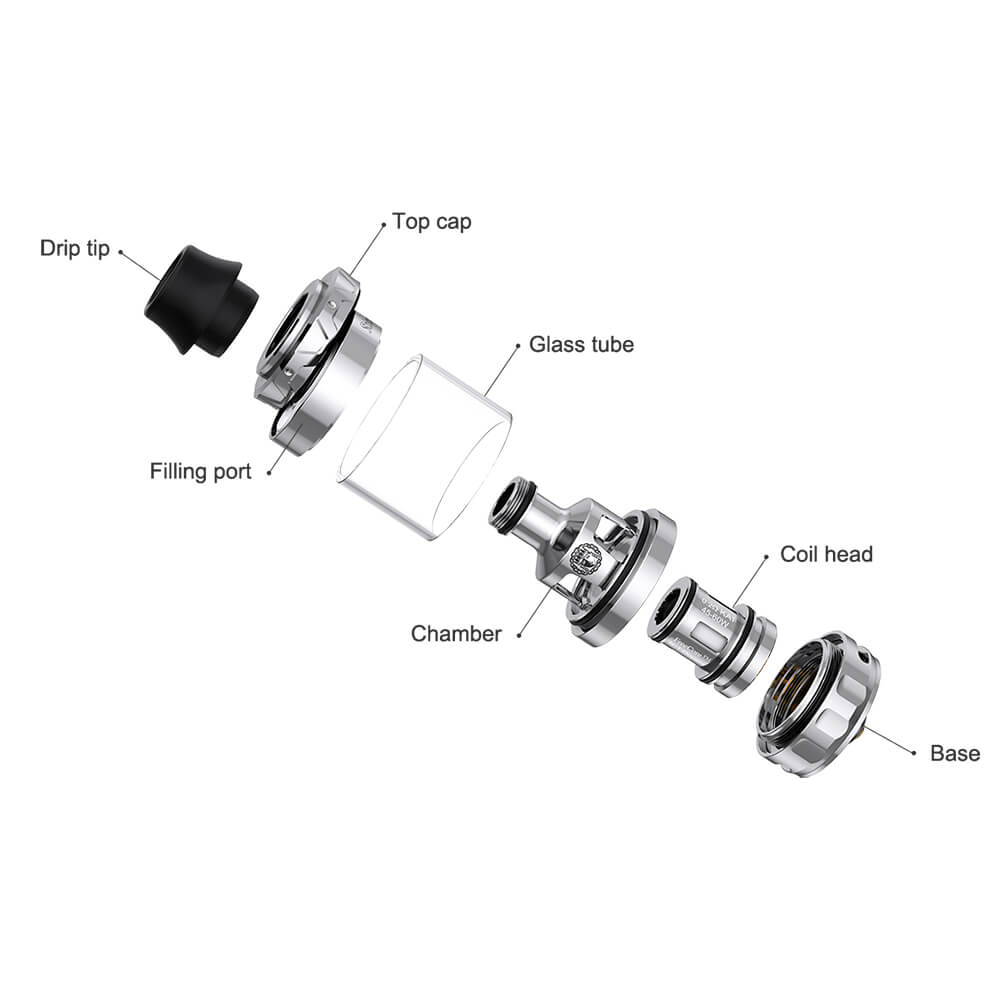 Visuell überzeugt der Verdampfer mit schlichter Eleganz und einer hohen Wertigkeit. Er besteht aus bestem Edelstahl und Pyrexglas. Zwischen drei Farben (Schwarz / Silber / Gunmetal) kann gewählt werden. Er ist 50.3mm lang, bei einem Durchmesser von 25mm.
