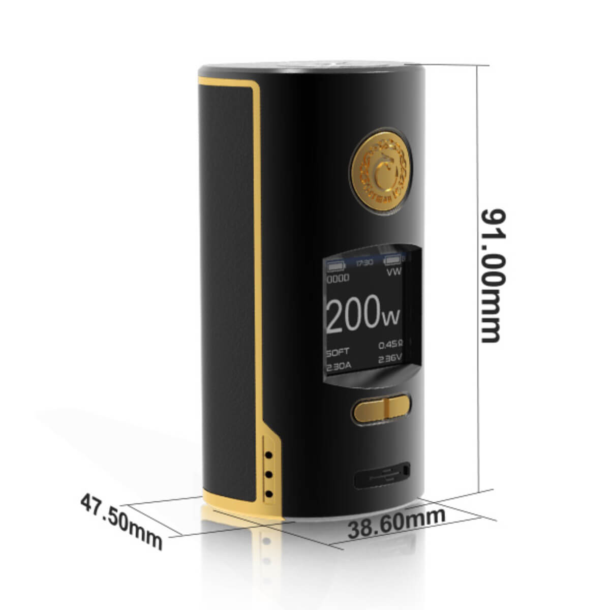 Modern, zeitlos und hochwertig sind die ersten Eindrücke, die man visuell erkennen kann. Der Mod liegt, Dank der angenehmen Größe (91mm x 47.5mm x 38.6mm) komfortabel in der Hand, ist nicht zu klobig, aber auch kein Winzling. Alle Knöpfe sind gut erreichbar und lassen sich bequem nutzen. Ein besonderer Hingucker ist der detailreich verzierte große Feuerknopf.
