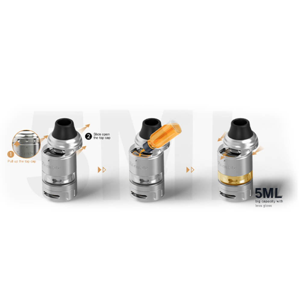 Mit dem Kriemhild Tank ist Vapeflay ein weiterer Clou gelungen. Er kommt in vier verschiedenen farblichen Versionen auf den Markt und verfügt über ein 510er Gewinde und ein 810er Drip Tip.
