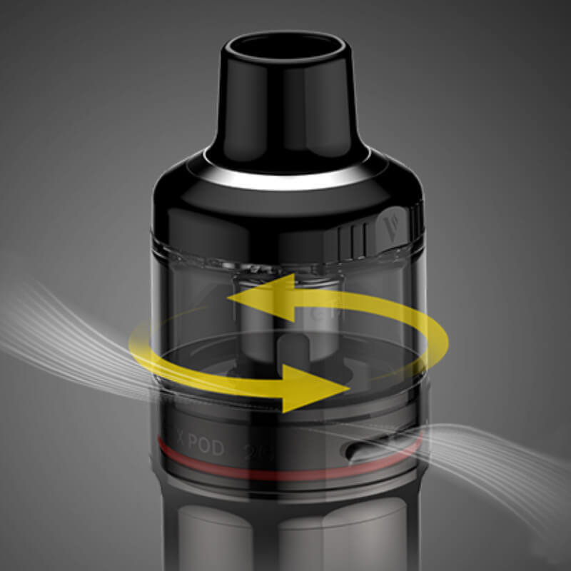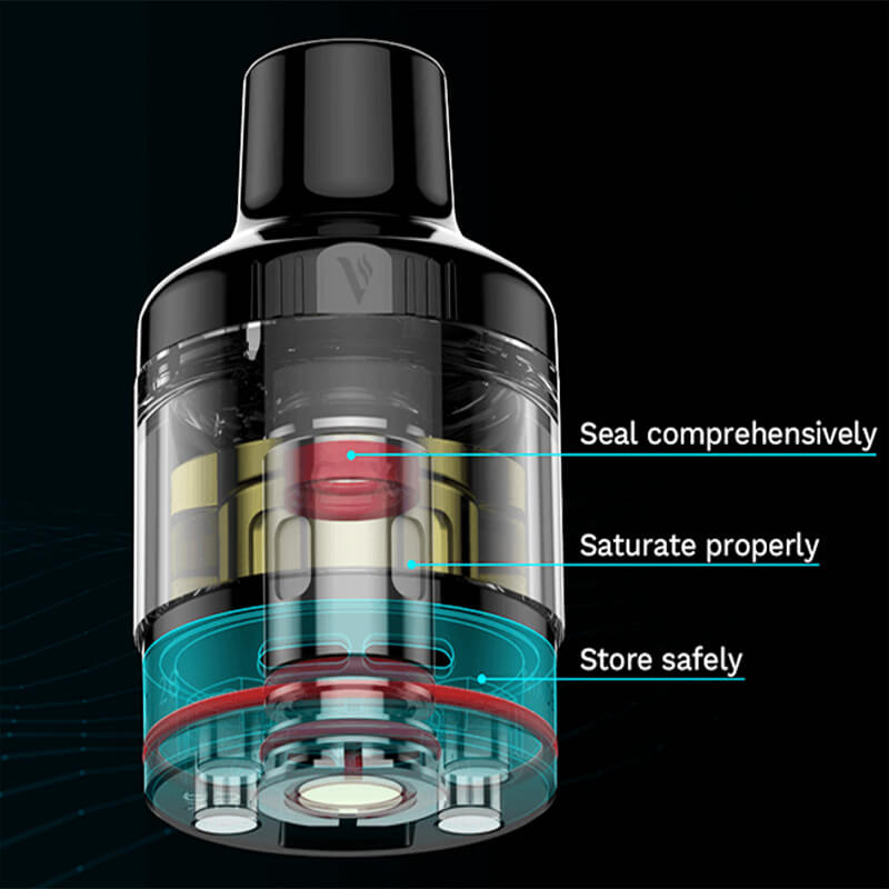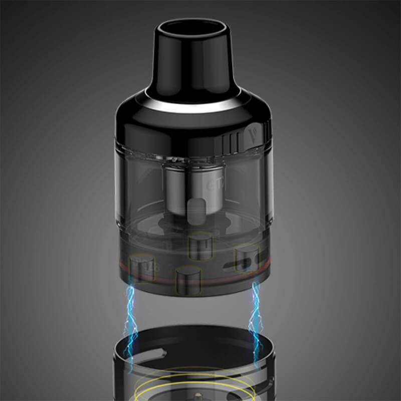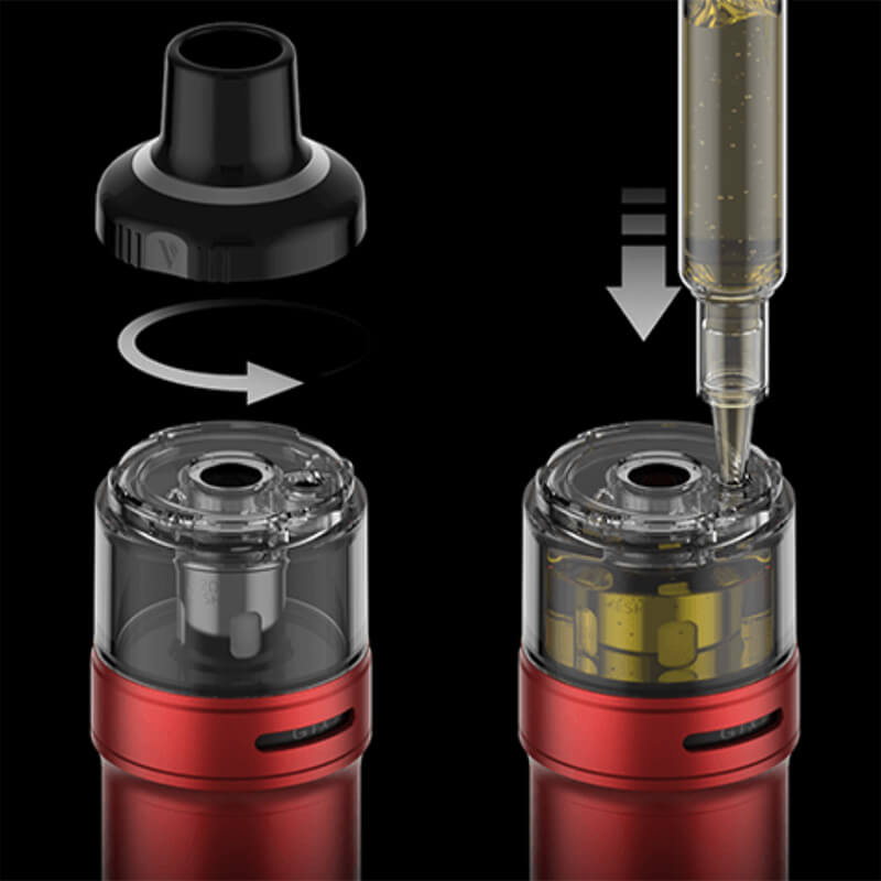 Der transparente Pod bringt ein 5ml Tankvolumen mit, welches über das Topfilling, mit abnehmbarer Cap, mit Liquid befüllt wird. Die Befestigung geht magnetisch vonstatten und hält Cartridge und Batterie fest zusammen.