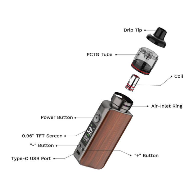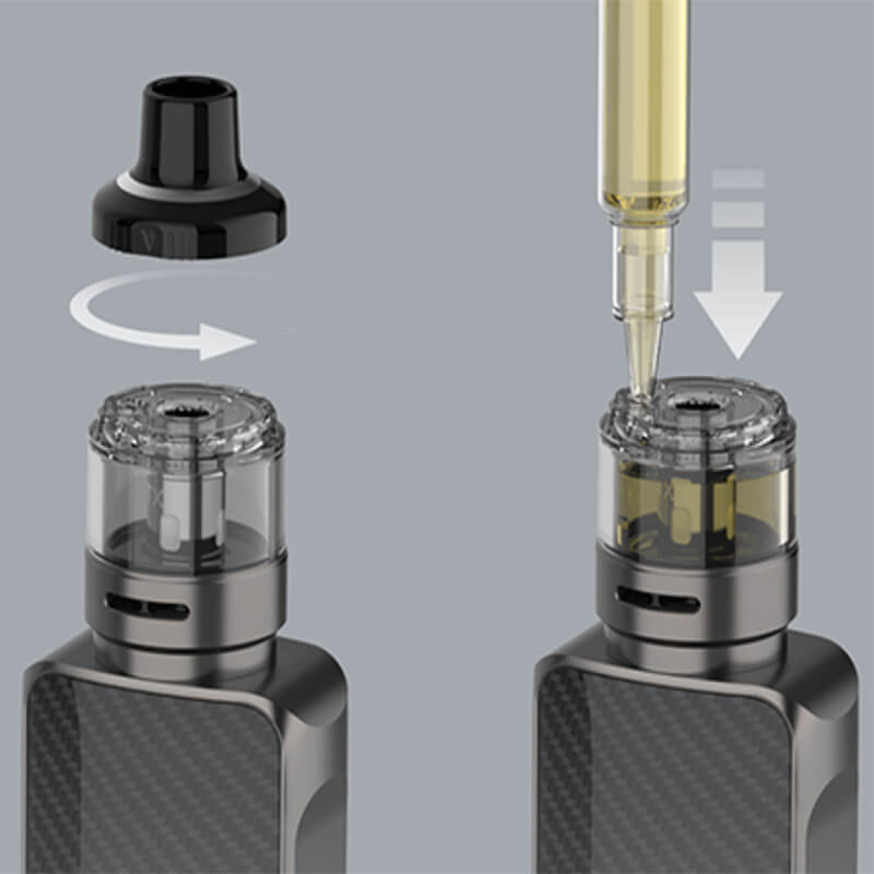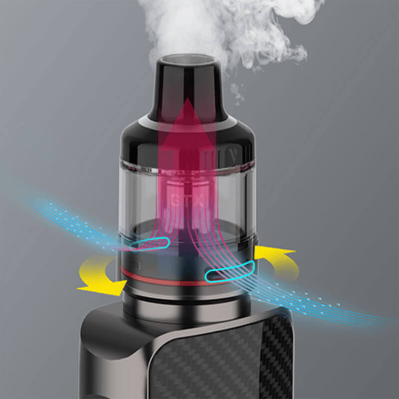 Der Mod wird mit dem GTX 26 Pod kombiniert, welcher ein von oben zu befüllendes 5ml Tankvolumen mitbringt und mit den Verdampferköpfen der GTX Coil-Serie kompatibel ist. Mit der Bottom Airflow wird der Luftzug geregelt, so dass einem entspanntem MTL und DL Vapen nichts im Wege steht.
