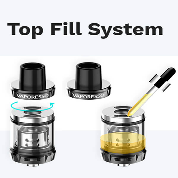 Ergänzt wird der Mod durch den SKRR-S Mini Tank, der über ein 3.5ml Füllvolumen verfügt. Durch das altbewährte Topfilling wird das Liquid in den Tank gegeben. Dazu wird die Top Cap entfernt, so dass die beiden Liquid-Einfülllöcher erscheinen und genutzt werden können. Er verwendet das komplette Sortiment der GT und QF- Coils, die zusätzlich noch die zwei neuen Verdampferköpfe QF Mesh 0.2 Ohm und QF-Strips 0.15 Ohm dazubekommen haben. Diese können sehr viel Dampf und ebensoviel Geschmack liefern. Mit der Bottom Airflow lässt sich der Luftzug je nach Bedarf kontrollieren.