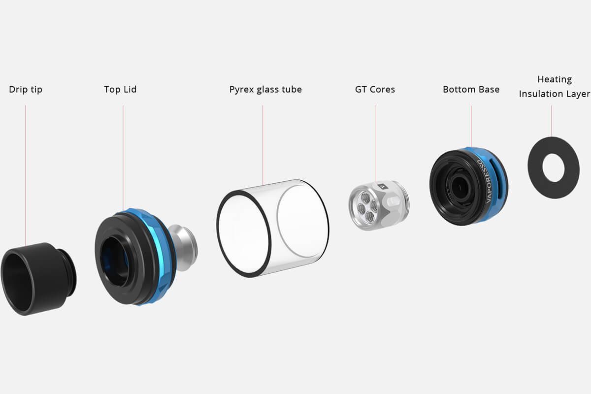 Der NRG Tank besitzt ein beachtliches Tankvolumen von 5ml und wird von oben durch leichtes Aufschieben der Topcap befüllt. Er verwendet die gesamte Vaporesso GT Verdampferkopfreihe und lässt sich somit in einem Wattradius von 15 – 110W betreiben.