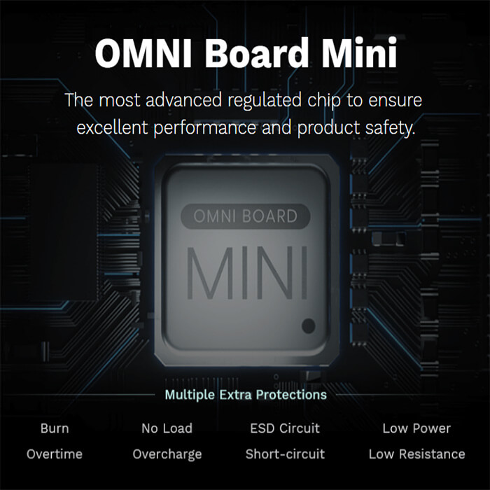 Der OMNI Board Mini Chip bringt für die Produktsicherheit verschiede Schutzsysteme mit, wie z.B. den Schutz vor einer Überladung oder einem Kurzschluss.
