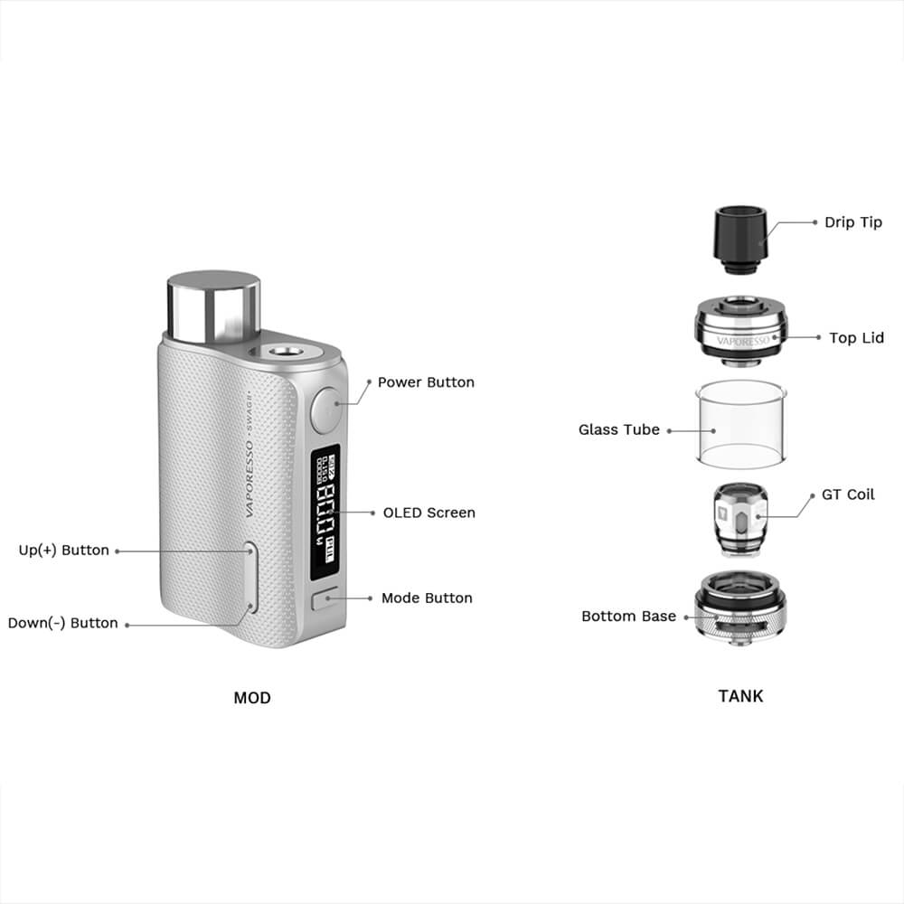 Vaporesso bringt mit dem Swag II Kit nun die nächste Generation aus der Swag Familie auf den Markt. Das Kit wird aus dem Swag 2 Mod und dem NRG PE Tank gebildet.