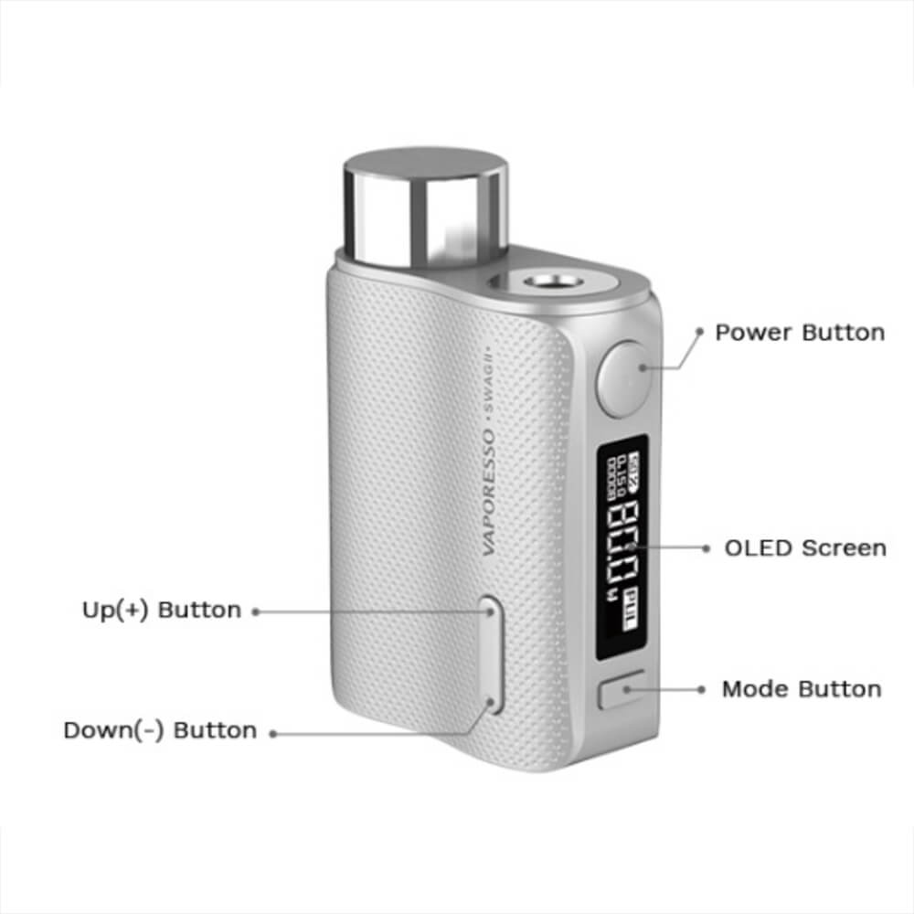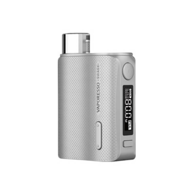 Der Swag 2 Mod von Vaporesso ist die zweite und verbesserte Ausgabe des vorhergegangenen Swags und besticht durch seine handlichen und ergonomischen Maße (75mm x 50mm x 25mm). Dank der Kurven liegt er gut in der Hand und kann aufgrund der gummierten Beschichtung in schwarz oder in silber nicht so leicht zerkratzen. Zusätzlich ist der Mod dadurch besonders griffig und es gibt keine unschönen Fingerabdrücke.