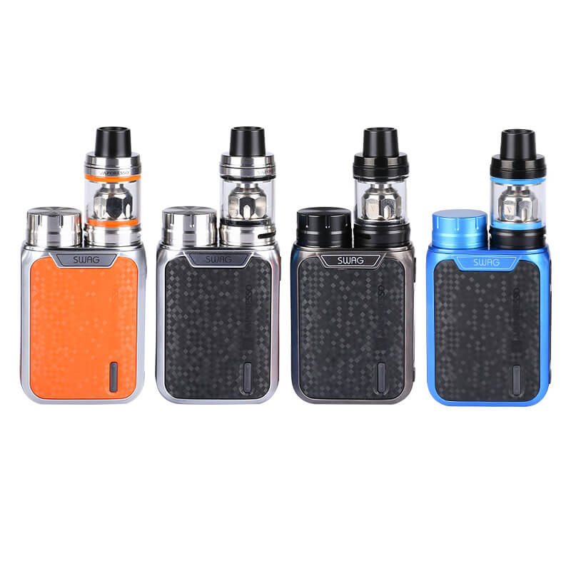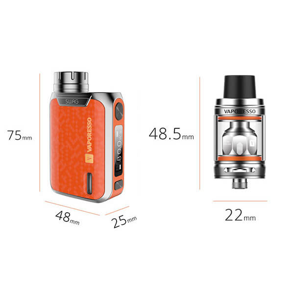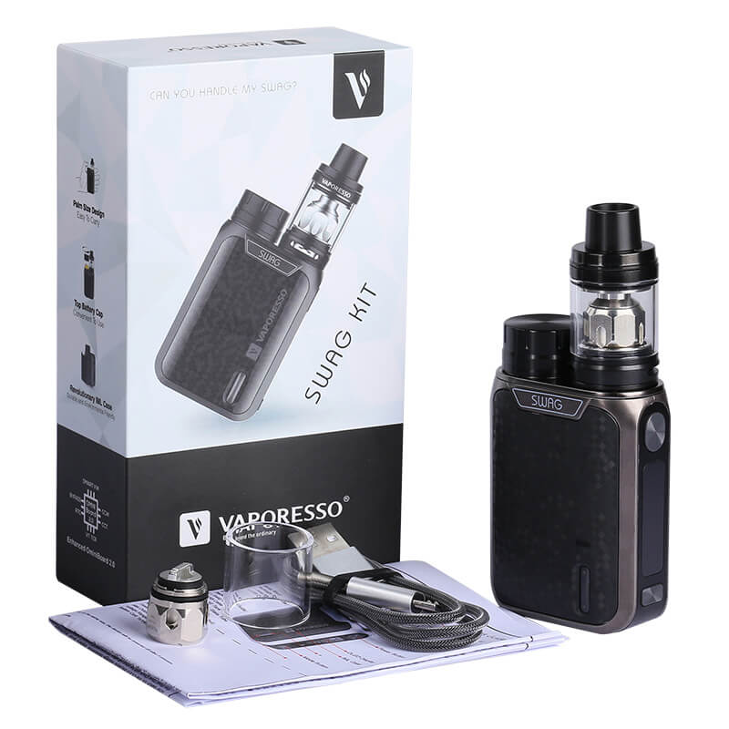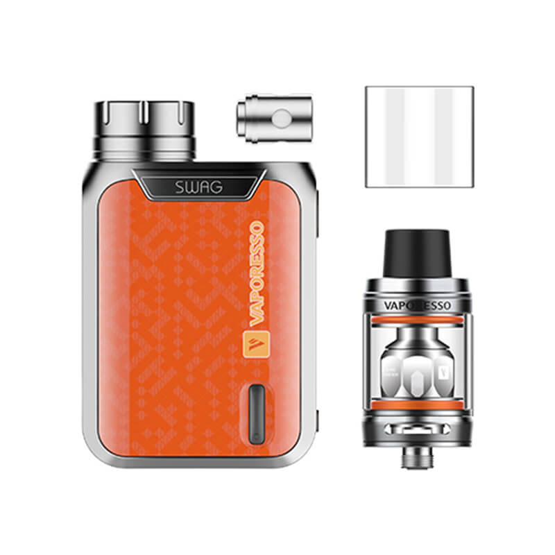 Das Vaporesso Swag Kit besteht aus dem Swag Mod und dem NRG SE Verdampfer. Der Mod ist mit dem OMNI Board 2.0 Chip ausgestattet und bringt bis zu 80 Watt Leistung. Der NRG SE hat ein Tankvolumen von 3.5ml und wird von oben über das Twist-Open System befüllt. Die Kombination liegt dank der abgerundeten Kanten nicht nur gut in der Hand, sie hat auch eine IML-Beschichtung, welche es Kratzern schwerer macht und Lackschäden vorbeugt.