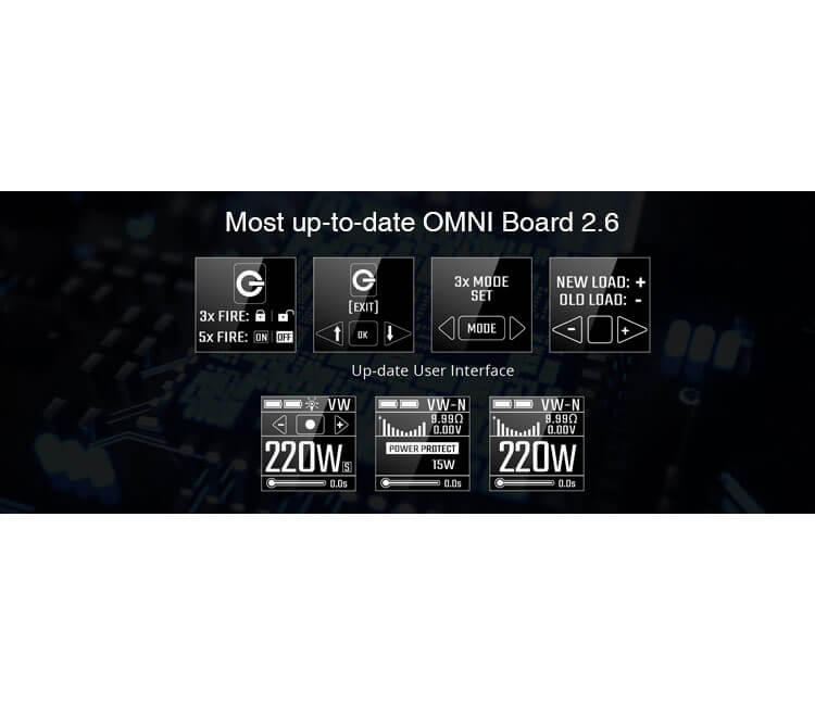 Die Formgebung des Mods ist besonders komfortabel gestaltet und die abgerundeten Kanten, sowie die Größe gewährleisten ein angenehmes Handling. Eine Besonderheit besteht darin, dass das Case veränderbar ist. Die Deko-Blenden können nach Belieben ganz einfach und schnell ausgetauscht werden. Dazu muss lediglich das Akkufach geöffnet sein, so dass die Blende herausgezogen werden kann. Film – und Comicfans dürften das Design durchaus an bekannte Helden erinnern. Mit der gelungenen Optik zum einen, liefert der Switcher Akkuträger zum anderen auch Technik der neueren Generation. Wenn zwei zusätzlich erworbene 18650er Batterien eingesetzt wurden, dann kann der Mod bis zu 220 Watt erzielen. Der topaktuelle OMNI 2.6 Chipsatz unterstützt alle bekannten und relevanten Modis. Sämtliche informativen Parameter werden auf dem 0.96 Zoll Display übersichtlich entnommen. Die Bedienung des Menüs ist einfach und wird mit den gut erreichbaren Tastern gesteuert.