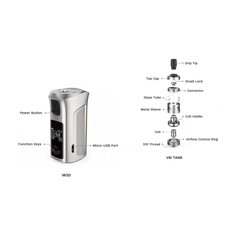 Mit dem neuen VM 22 Verdampfer wird das Set komplett gemacht. Dieser leicht zu handhabende Tank verfügt über ein 2ml Füllvolumen, welches via Topfilling betankt wird. Für aromatische Geschmackserlebnisse sorgen die im VM 22 verwendeten EUC-Verdampferköfe (1 Ohm Ceramic Coil oder 0.6 Ohm Meshed Coil). Diese können bei Bedarf spielend einfach erneuert und ausgetauscht werden.