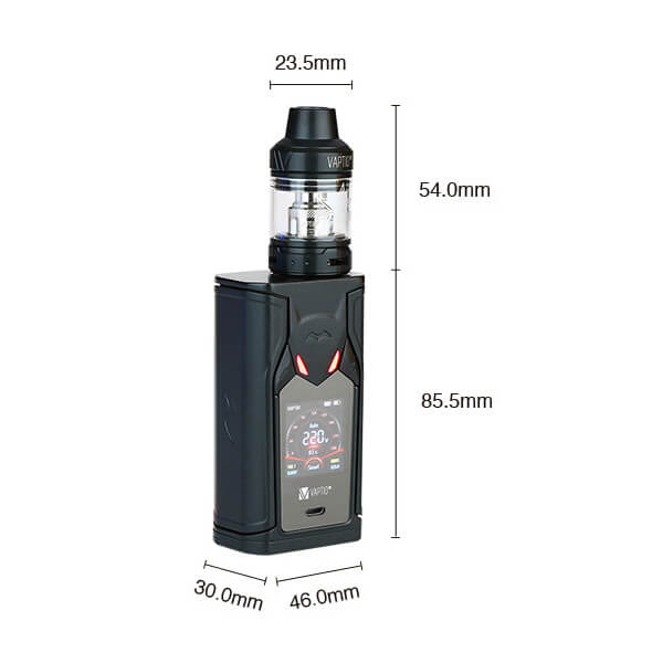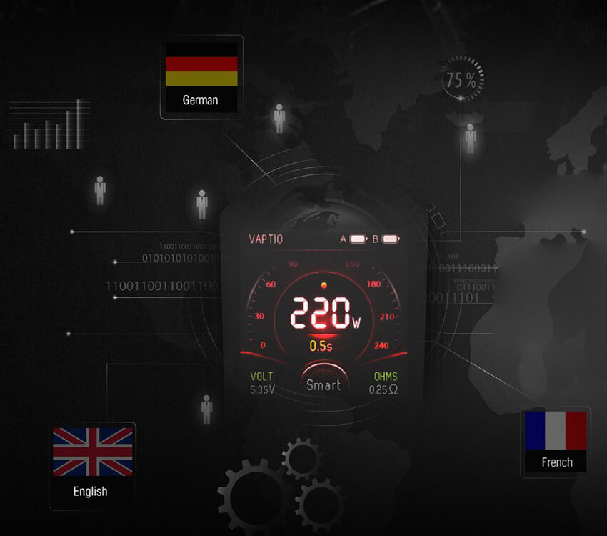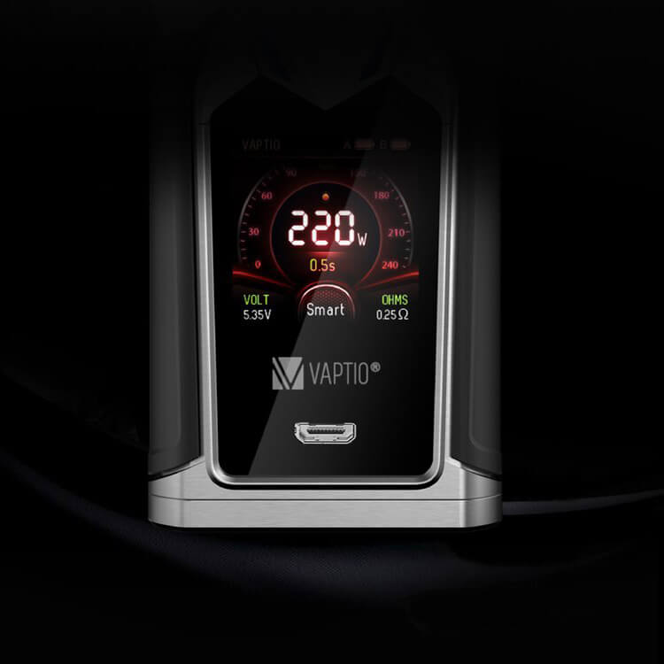 Der Superheld-Mod im Batman Style bringt eine ihm gerecht werdende maximale Ausgangsleistung von bis zu 220 Watt mit, angetrieben von 2x 18650er Akkus, die einen zusätzlichen Kauf erfordern. Eine rasche und effiziente Aufladung der Zellen erfolgt über den USB-Port mit 2A. Es stehen wie gewohnt der Watt - und Temperatur-Modus zum arbeiten bereit, ergänzt durch 3 weitere Smart-Modi, bei denen die persönlichen Präferenzen angeglichen werden können. Angezeigt werden diese und weitere Dampfdetails auf dem 1.3 Zoll Display. Dem leicht zu manövrierendem Menü stehen 6 Farb- und 3 Beleuchtungs-Optionen zur Verfügung.