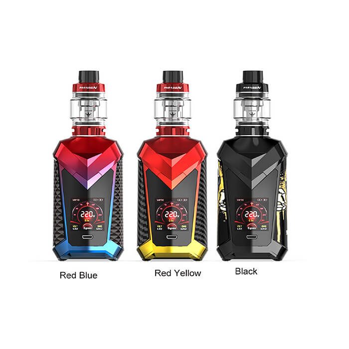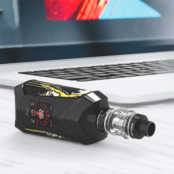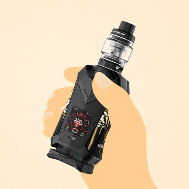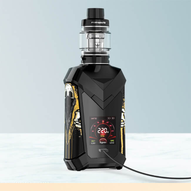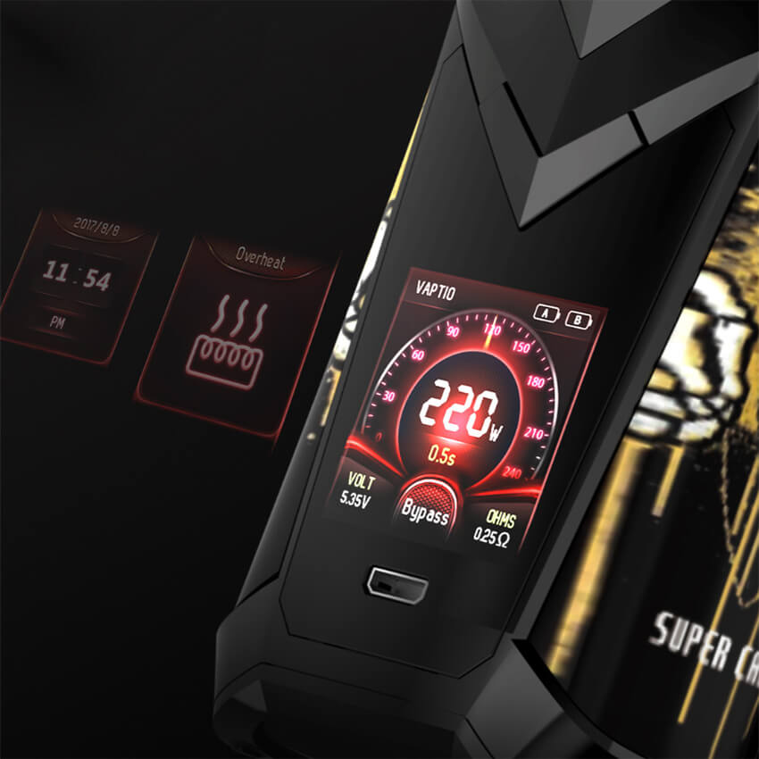 Der Akkuträger passt gut in die Hand und alle Bedienelemente sind komfortabel erreichbar. Ein besonders Augenmerk wurde auf die optischen Details gelegt. Das Gehäuse wurde mit einem speziellen Sprühlack mit Farbverlauf versehen (außer bei dem schwarzen Model), zusätzlich wurden auch die Seiten verziert. Das Cape auf der Rückseite wird mit einer farblichen LED-Beleuchtung aufgewertet. Er läuft sobald 2 x 18650er Batterien in das Akkufach eingesetzt wurden. Diese müssen zusätzlich erworben werden. Auf Knopfdruck an der Frontseite öffnet sich das Fach, so dass die Zellen mühelos ausgetauscht werden können. Geladen werden sie via USB-Anschluss mit 2A. Der verbaute Chip feuert superschnell in 0.005 Sekunden und kann bis zu 220 Watt bei einem Widerstandbereich von 0.1Ohm – 5Ohm erreichen. Die Modi VW / TC / Smart / CCW /CCT und BYPASS können genutzt werden. Alle benutzerrelevanten Informationen entnimmt man dem 1.3 Zoll TFT-HD- Farbbildschirm, dass alle Werte klar wiedergibt. Die Menüsteuerung ist sehr benutzerfreundlich gestaltet.