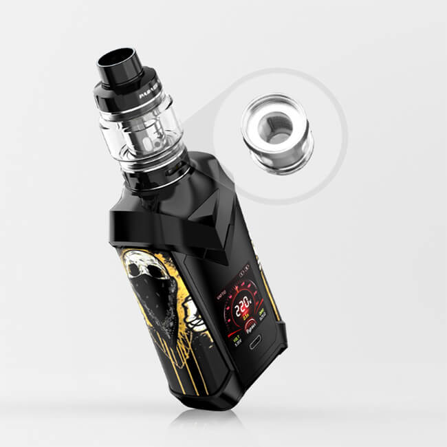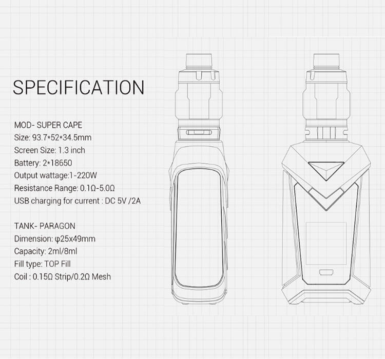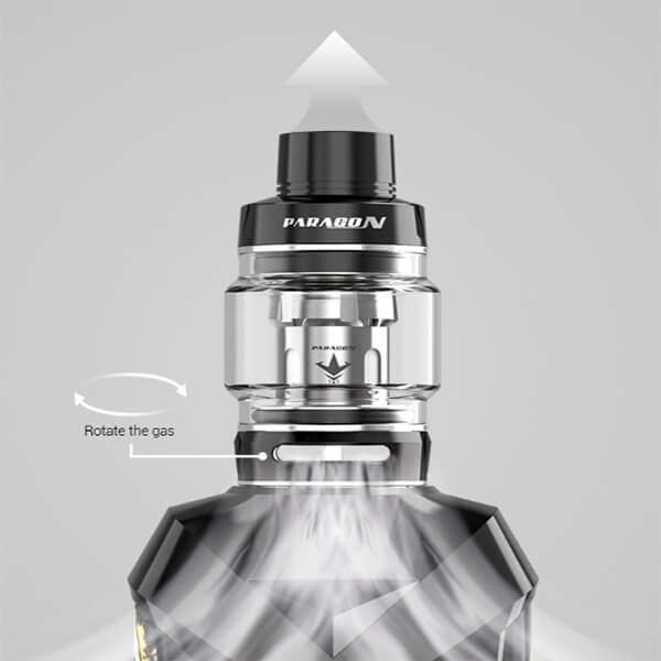 Optimal und eines Superhelden würdig, wird dieser Mod mit dem Paragon Subohm Tank kombiniert, der nicht nur für dichte, dicke Wolken sorgt, sondern auch mit einem beträchtlichen Füllvolumen von 8ml aufwartet. Dieses wird über die Topfill Methode mit Liquid betankt. Genutzt wird der Verdampfer zum einen mit dem Paragon Mesh Coil, der einen Widerstand von 0.2Ohm/40W-90W mitbringt oder zum anderen mit dem Strip Verdampferkopf 0.15Ohm/40W-100 W. Beide sind ausgelegt für den direkten Lungenzug (DL). Die am Boden positionierte AFC kann nach Bedarf ausgerichtet werden und unterstützt mit ihren Luftzug die Entstehung von Geschmack und Dampf.