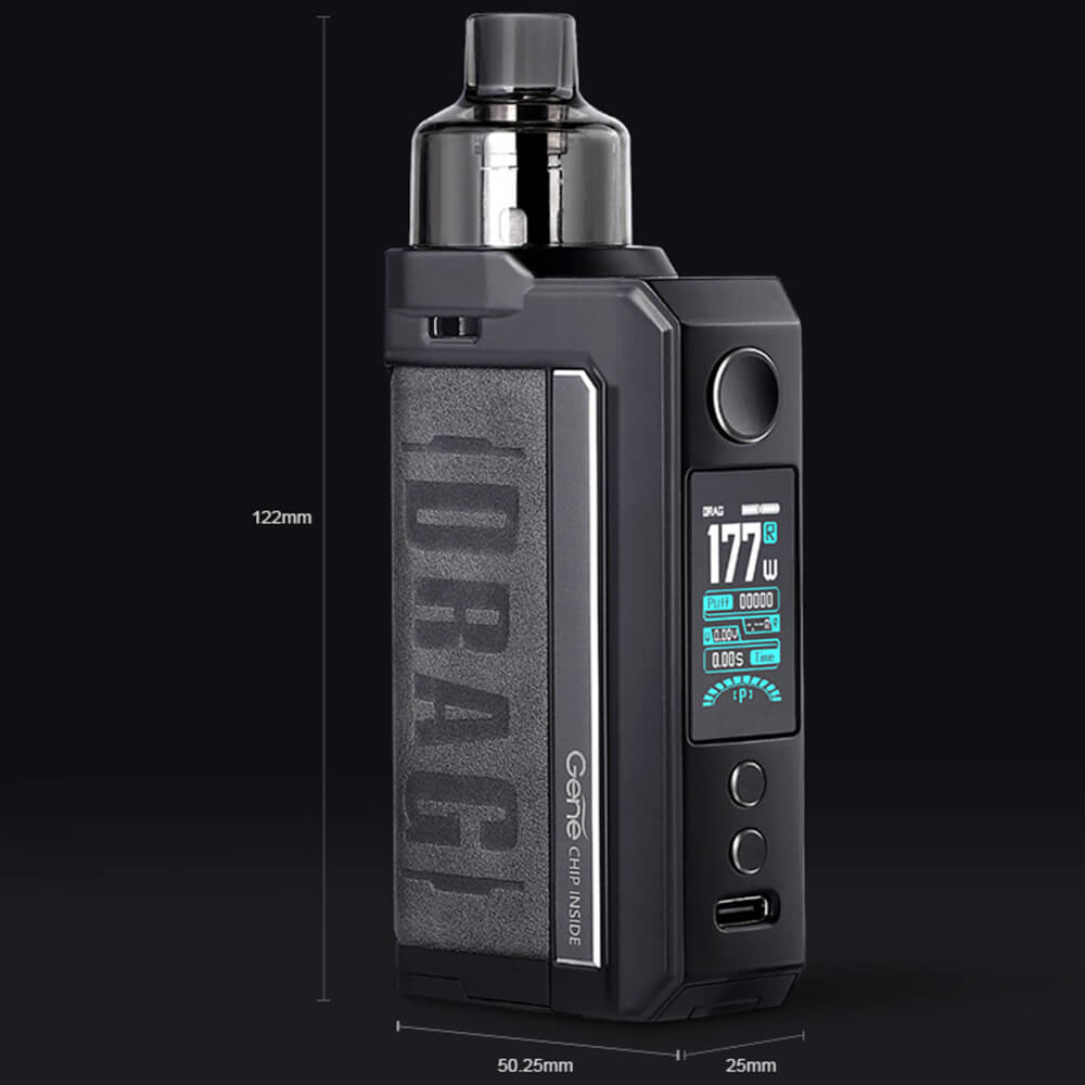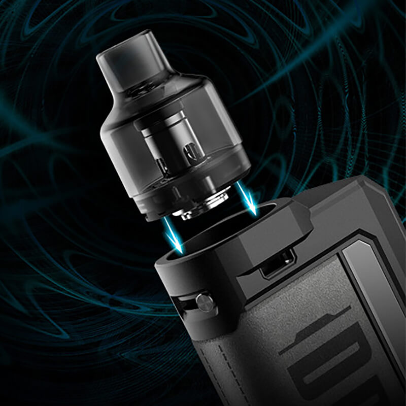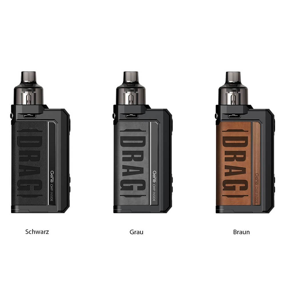 Der Pod wird komfortabel magnetisch befestigt. Er bringt ein 4.5ml Tankvolumen mit, welches stets wiederbefüllt (Bottomfill) werden kann. Die Cartridge verwendet die austauschbaren PnP Verdampferköpfe. VOOPOOs Drag Max Kit ist rundum gelungen und in Schwarz, Grau und Braun erhältlich.