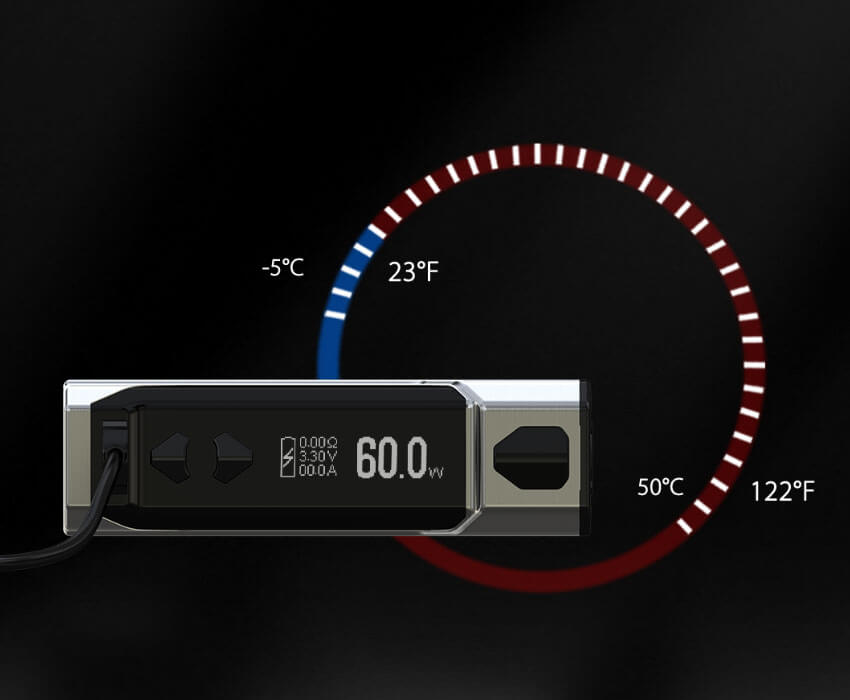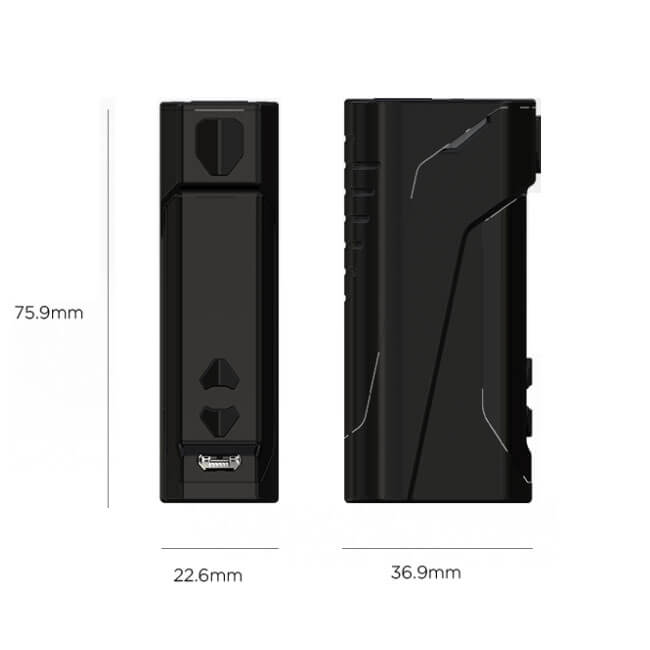 Der Mod verfügt über eine verbaute Akkukapazität von 2300mAh und kann eine maximale Leistung von 60W erarbeiten. Der 0.91 Zoll große Bildschirm fügt sich dem Gesamtbild perfekt ein und gibt Auskunft über alle wichtigen Werte. Spielend leicht ist auch die Menüführung, die mit den Bedientasten unterhalb des Displays gesteuert wird. Es ist besonders leicht den CB – 60 Mod zu verwenden, da alle Knöpfe, sowie der Feuertaster komfortabel erreichbar sind. Zudem sorgt die ergonomische Beschaffenheit dafür, dass der Akkuträger angenehm in der Hand liegt.