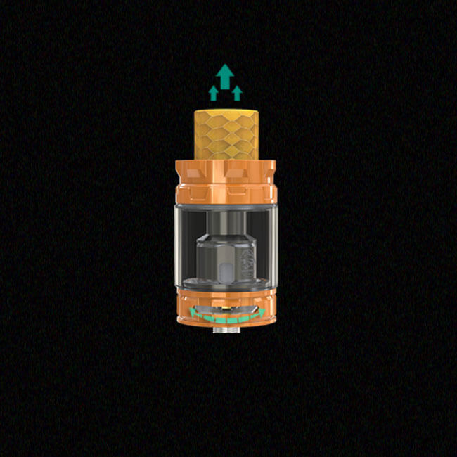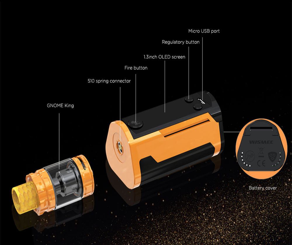 Für ein vollständiges Kit wird selbstverständlich auch ein Verdampfer benötigt. Wismec setzt bei diesem Set auf den neuen GNOME King Tank mit seinem stattlichen 5.8ml Fassungsvermögen. Aufgefüllt wird dieses Volumen mit Hilfe der TopFilling Methode. Einfach die Cap zur Seite sliden und anschließend das Liquid durch das große Füllloch geben. Für satten Geschmack und jede Menge Dampf sorgen die im GNOME King verwendeten WM – Verdampferköpfe (0.15Ohm – 0.4Ohm). Diese werden durch die Bottom Airflow gut belüftet, zudem kann der Zugwiderstand mit der AFC präzise und stufenlos eingestellt werden.