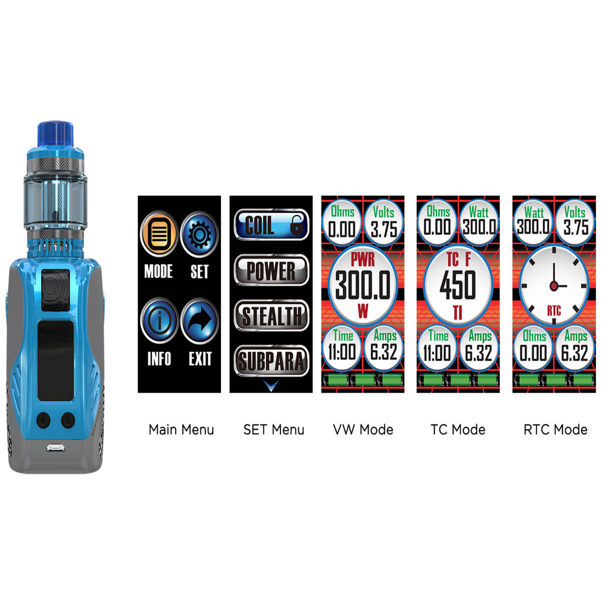 Ganze drei 18650er Akku-Batterien (nicht Teil der Lieferung) treiben den Mod an und liefern bis zu satte 300 Watt Leistung. Das Aufladen erfolgt rasant durch das mitgelieferte USB-Kabel mit 2A. Durch den Avatar-Chip wird ein Multi-Schutzsystem eingesetzt, welches die Gesamtsicherheit des Geräts gewährleistet und es so sicherer und zuverlässiger macht. Gearbeitet wird mit den Standard-Modi VW / TC-Ni / TC-Ti / TC-SS / TCR. Ein TFT-Farbbildschirm (0.96 Zoll) gibt alle Vape-Infos anstandslos wieder und verfügt über eine verbesserte Benutzeroberfläche. Wer möchte kann seinen Tinker Mod stets aktuell halten und die neueste Firmware downloaden.
